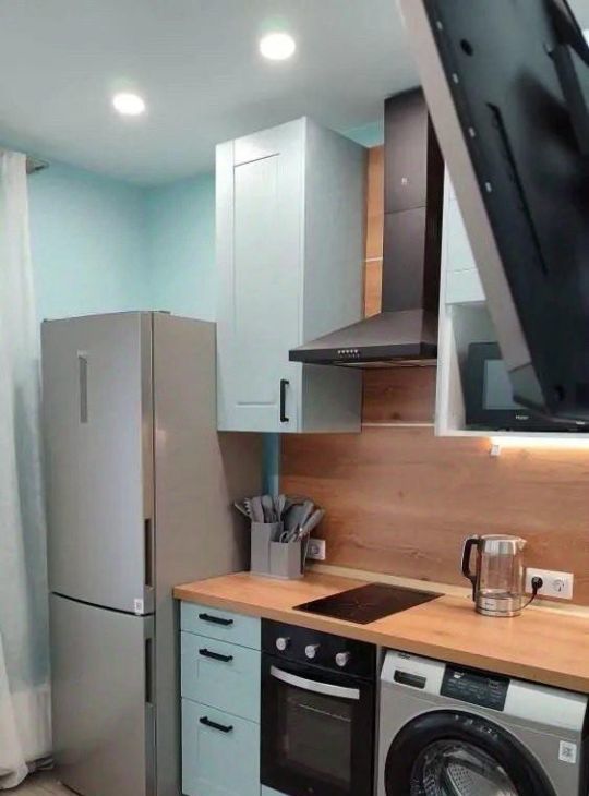О КВАРТИРЕ: Евро - ремонт с использованием импортных эко - материалов в отделке. Площадь 30.2 кв/м. 4-ый этаж. Потолки 2.8. Комната 14.7 кв/м. Кухня 8.7 кв/м. Застекленная лоджия 6.4 кв/м. Санузел совмещенный с душевой. Есть все необходимое для жизни: большой раскладной диван, шкаф платяной, прихожая, светильник напольный ИКЕА, гардеробная, стол обеденный и три стула, телевизор плазма, стиральная машина, вытяжка, духовой шкаф, микроволновая печь, двухкомфортная электро - панель, электрочайник, холодильник. Посудомоечной машинки нет.