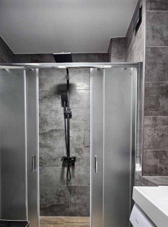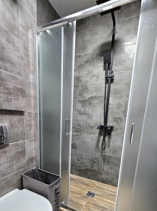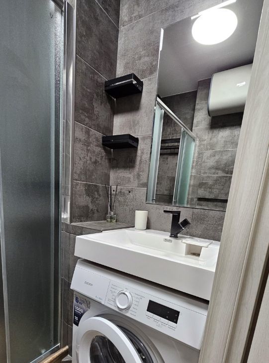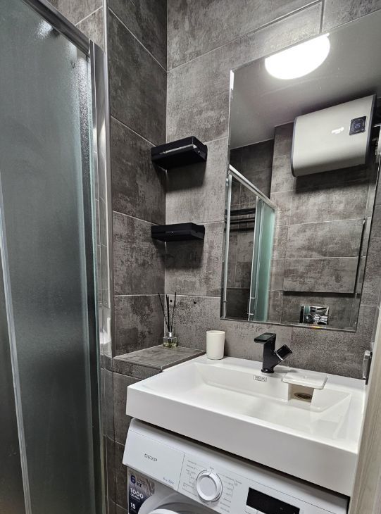 Санузел оборудован всем необходимым, в том числе стиральной машиной.