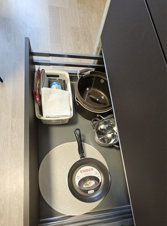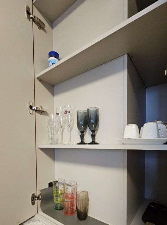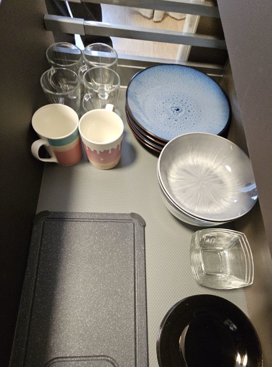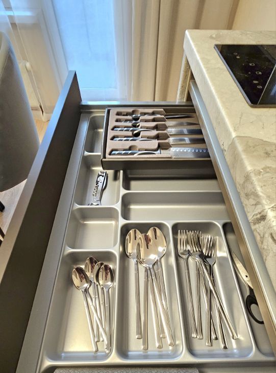 Комфортный угловой диван , который можно разложить, стильный круглый стол со стульями, варочная панель, холодильник, посудомоечная машина, жарочный шкаф, микроволновка, чайник, посуда для приготовления ,столовые приборы.