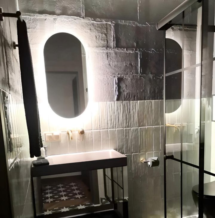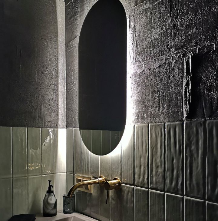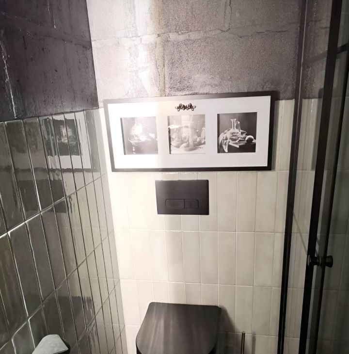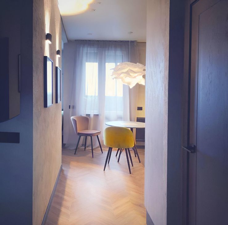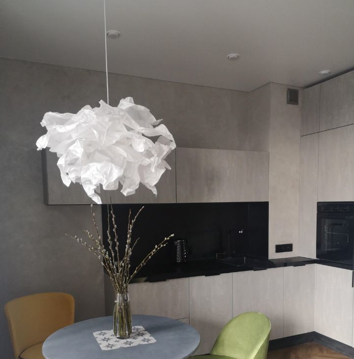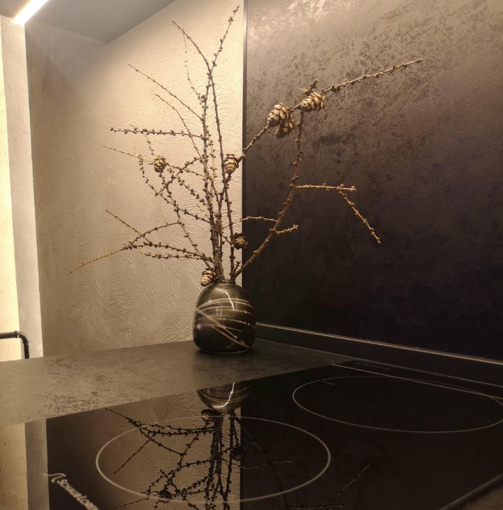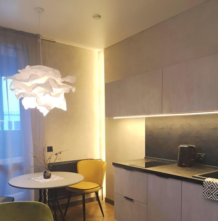 Кухонная мебель за счет фактуры и цвета полностью растворяется на фоне декоративной штукатурки стены, тем самым расширяя пространство. Кухня оснащена всем необходимым, а именно духовым шкафом, варочной поверхностью, большим холодильником, электрочайником, френч-прессом, бокалами для вина, шампанского и воды, стильной посудой и столовыми приборами на 6 персон, что позволит вам не только комфортно готовить, но и получать эстетическое удовольствие от приема пищи, сидя за элегантным столиком в удобных бархатных креслах-стульях.