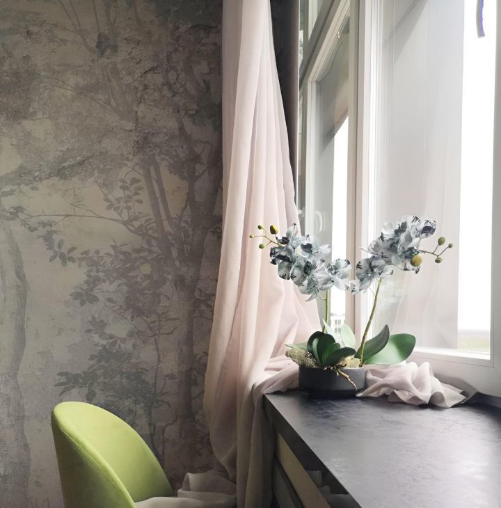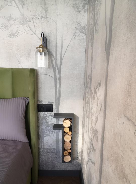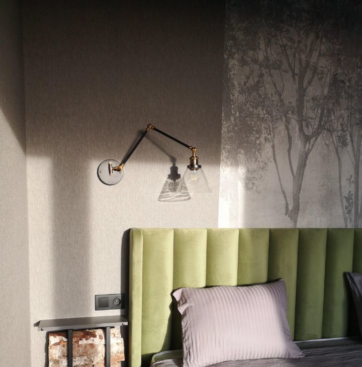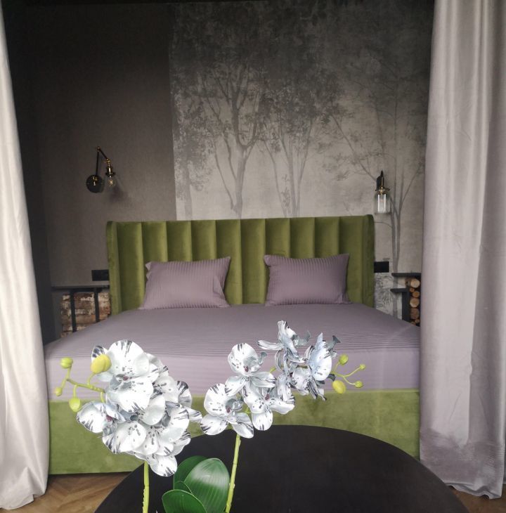 В зоне алькова особый уют создает красавица кровать евромакси размера с велюровой, сочной обивкой, ортопедическим матрасом, гипоаллергенными подушками и шелковистым постельным бельем. А также заботящиеся о вашем глубоком сне бархатные шторы, удобные светильники с лампами Эдисона и прикроватные полки-мини дровницы, подчеркивающие экологичность интерьера и близость Юнтоловского заповедника.