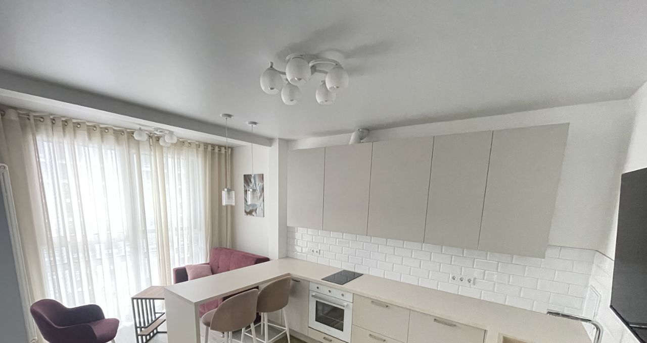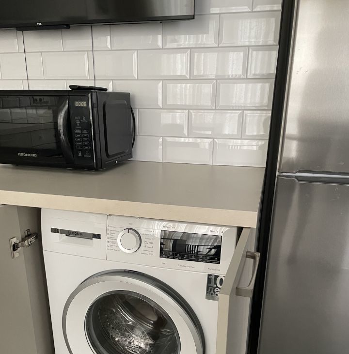 Кухня-гостиная: кухонный гарнитур, вся бытовая техника: холодильник, посудомойка, стиральная машина, духовой шкаф, свч, телевизор. Есть место отдыха у панорамного окна.