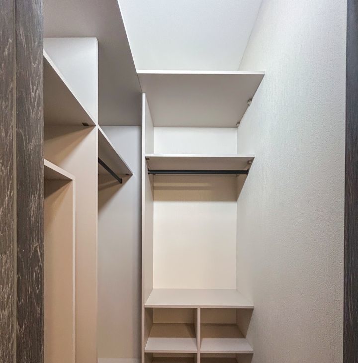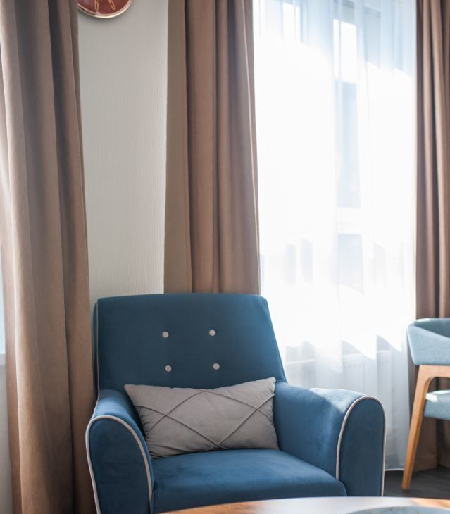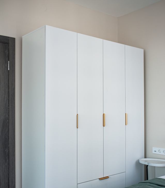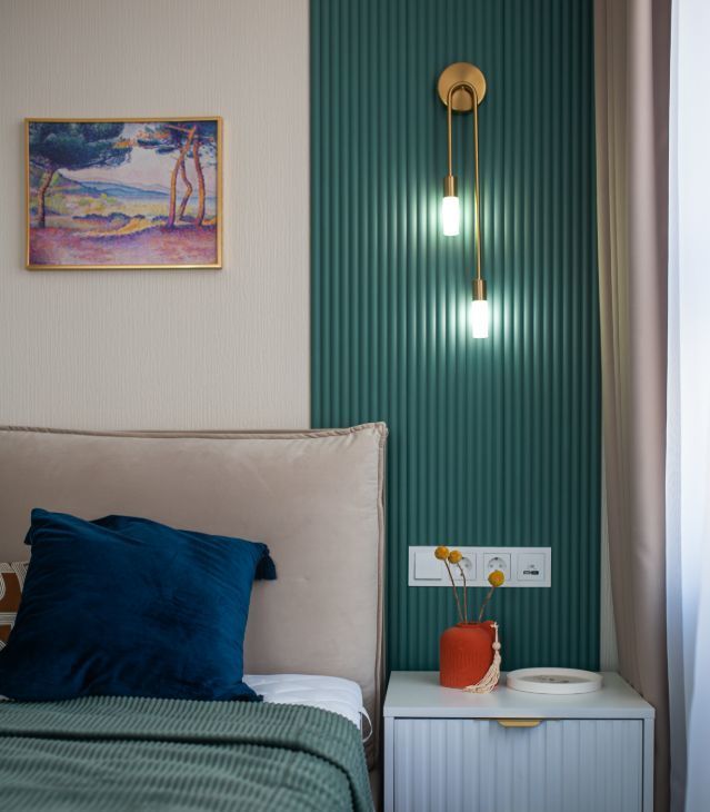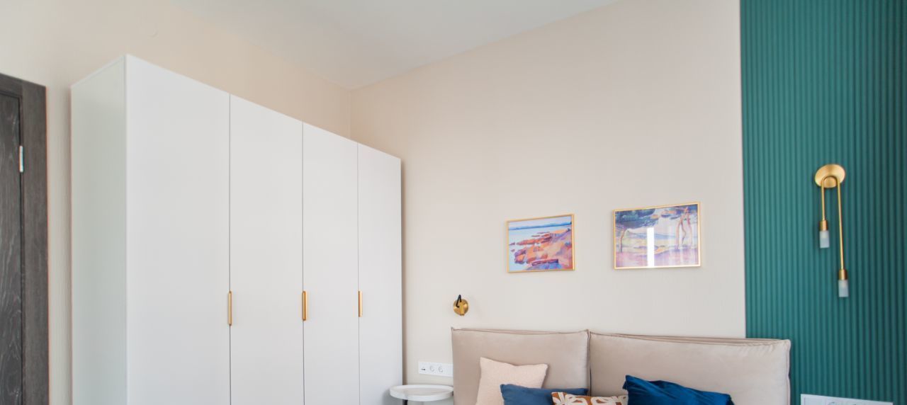 - уютная спальня : двуспальная кровать, вместительный шкаф, рабочая зона ( стол со стулом), кресло в зоне для отдыха.