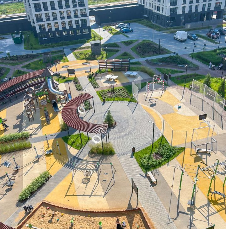 Прекрасный благоустроенный закрытый внутренний двор с детскими и спортивными площадками.