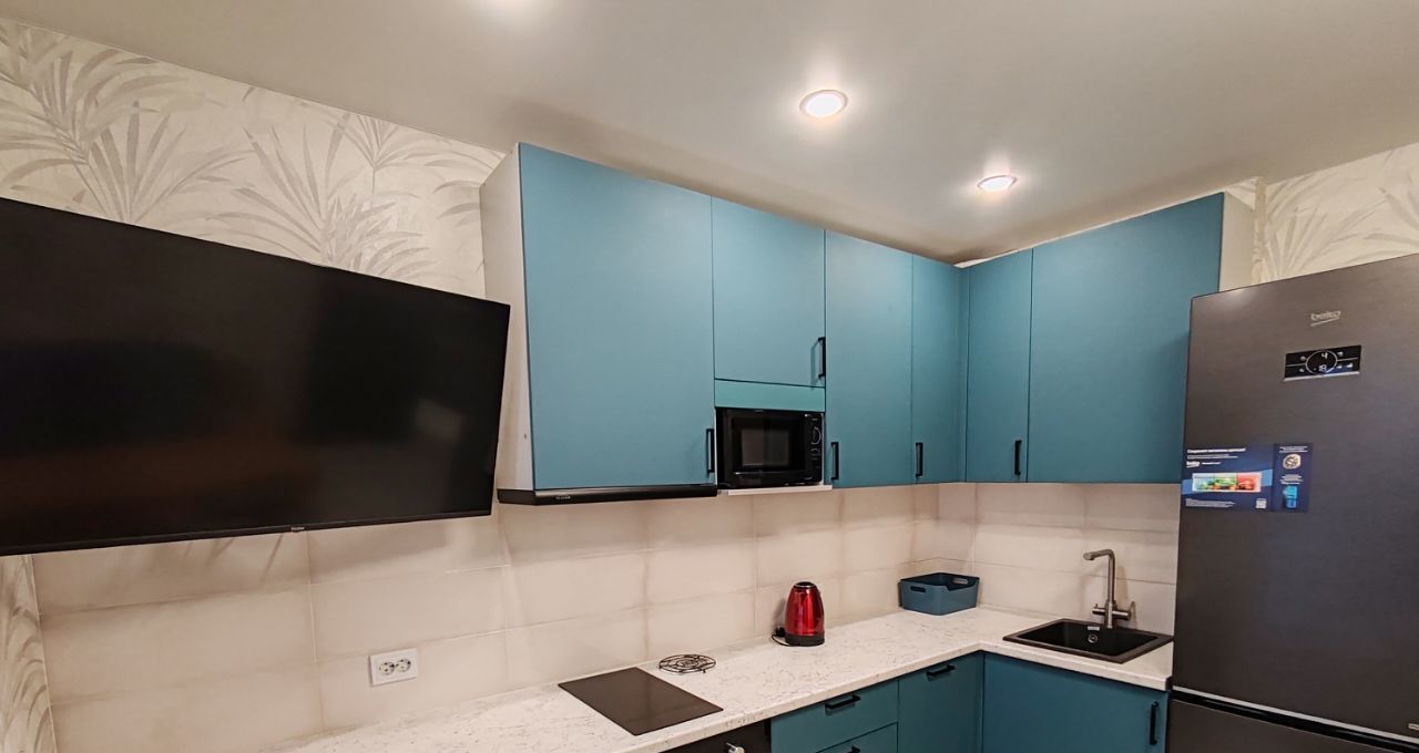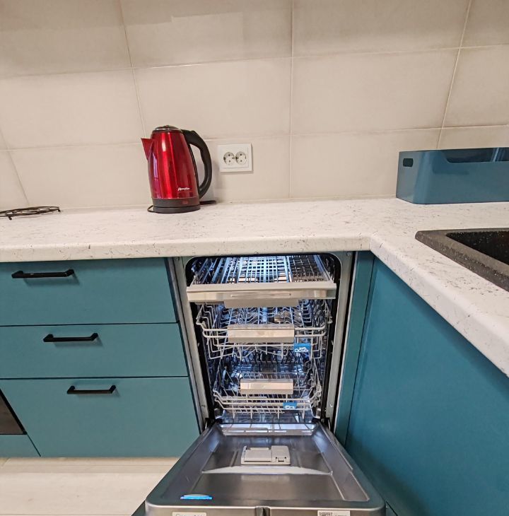 Вся необходимая техника: холодильник, духовка с конвекцией, плита (2 конфорки), микроволновка, посудомоечная машина, вытяжка, чайник.