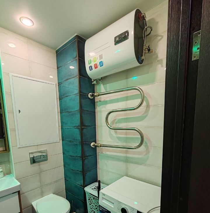 Чистый и современный санузел: ванна, подвесная мебель, водонагреватель.
