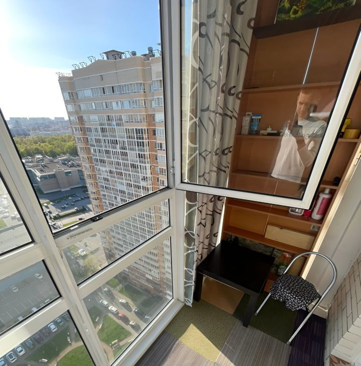 Большой балкон с панарамным остеклением. На балконе дополнительно шкаф, стеллажи, ковровое покрытие, блэкаут - полноценное пространство для отдыха.