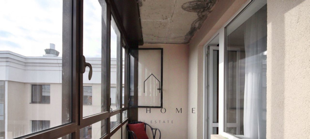 Замечательная планировка квартиры: просторный холл с вешалкой и шкафом для верхней одежды, совмещенный санузел с ванной, кухня-гостиная с раскладным диваном, оборудованная спальня, огромная лоджия с зоной отдыха, войти на которую можно из спальни и из кухни. Окна выходят в тихий аккуратный двор. За счет расположения квартиры на последнем этаже в ней всегда будет много света.