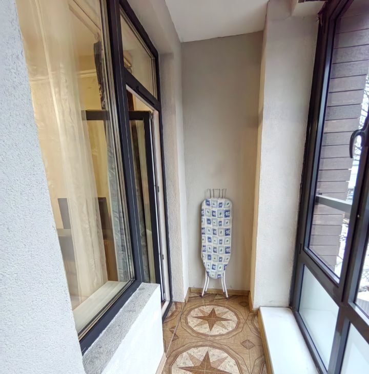 Просторная комната с выходом на большую застекленную лоджию, кухня-гостиная с витражным остеклением, сан.узел в кафеле.