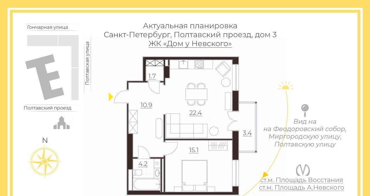 Представляем вам светлую, тихую, однокомнатную квартиру на 6 этаже, общей площадью 54 кв.м. в жилом комплексе Дом у Невского, окна которого смотрят на Феодоровский собор, крыши домов и Миргородскую улицу.