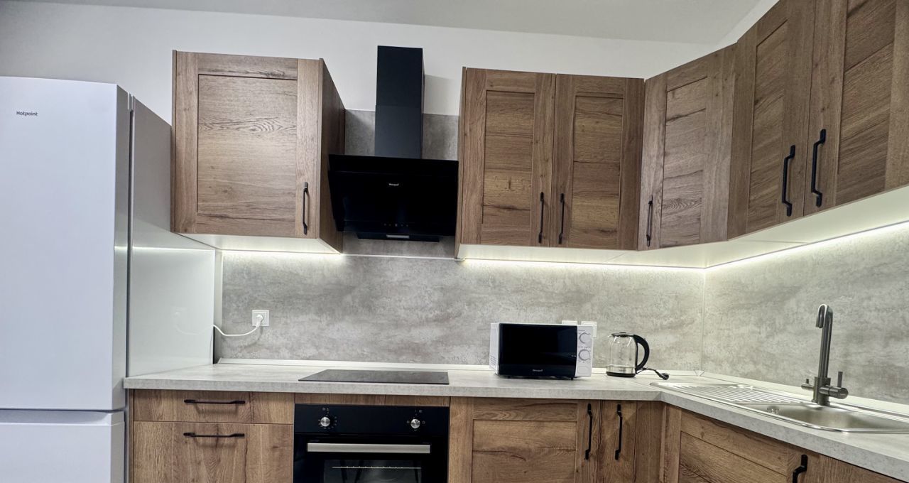 Квартира оборудована всей необходимой мебелью и техникой. Современный диван (раскладывается в доп. спальное место) с мягким и комфортным сиденьем, большой TV. Кухня со встроенной техникой: варочная панель и духовой шкаф Weissgauf, холодильник Hotpoint Ariston , посудомоечнаямашина, микроволновка, электрический чайник. В одном из шкафов стиральная машина.