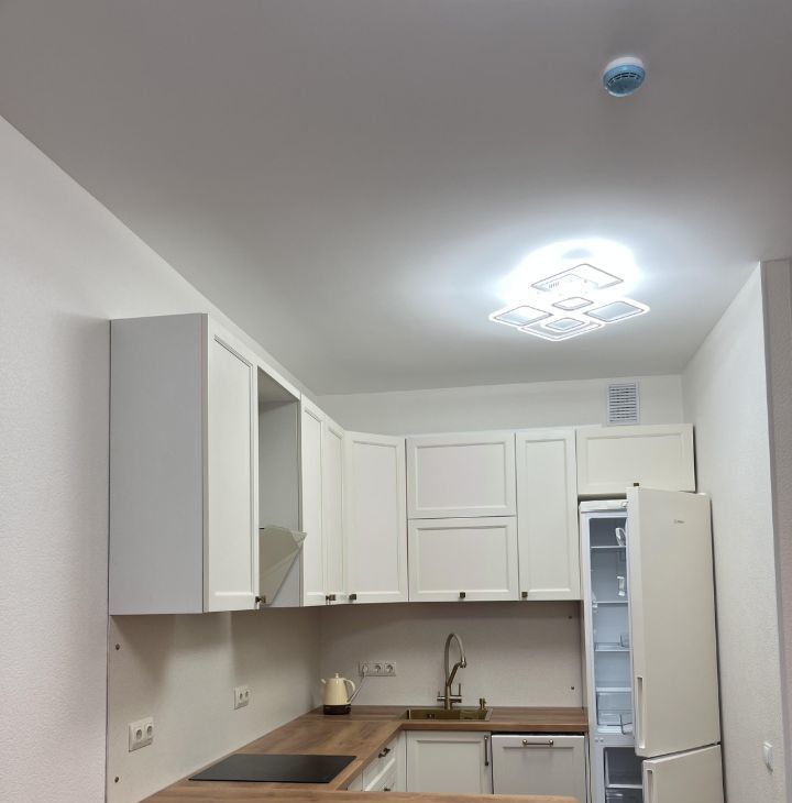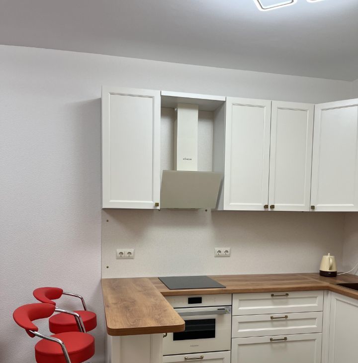 Встроенная кухня с варочной панелью , с холодильником, посудомоечной машиной, духовой шкаф с функцией СВЧ.