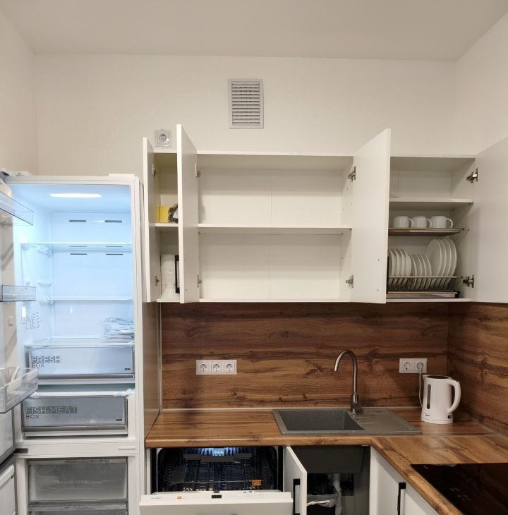 Квартира полностью оснащена мебелью (зоны хранения и спальные места), а также бытовой техникой (полноразмерные варочная панель и посудомоечная машина; высокий вместительный холодильник; кондиционер; стиральная машина).