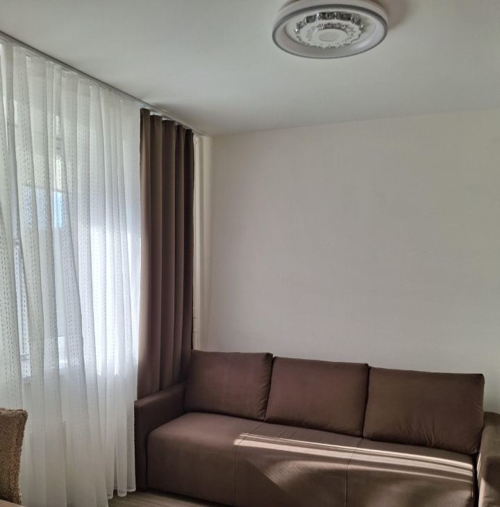 В квартире современный евроремонт. Светлая и просторная комната обставлена мебелью, а на кухне есть всё необходимое для комфортного проживания. Установлены холодильник и стиральная машина. Санузел совмещённый, с ванной. Из окон открывается вид на улицу, поэтому вас не будут беспокоить соседние здания.