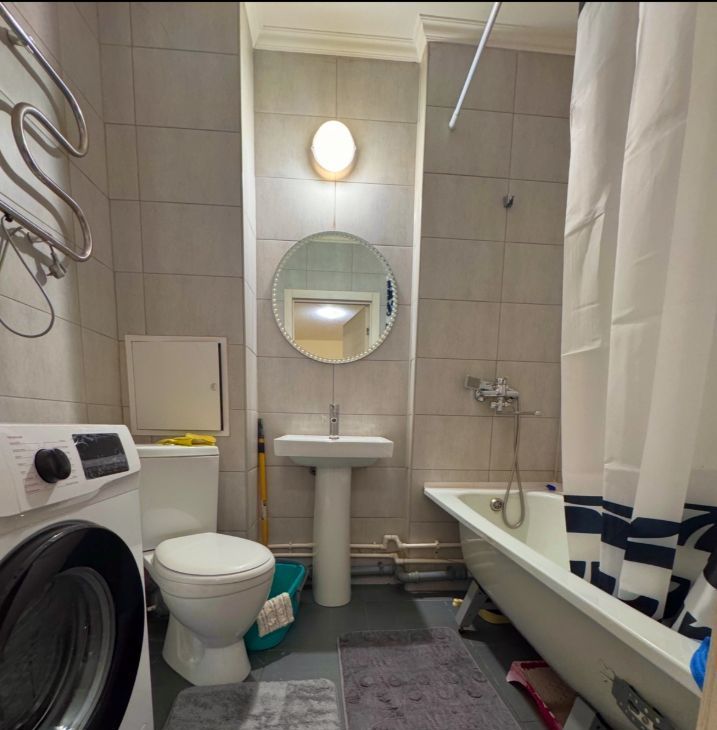 Ванная комната совмещённая, оформлена в светлых тонах. Из окон открывается вид на ухоженный двор с детской площадкой, школой, детским садом. Квартира сдаётся впервые. Вся мебель новая.
