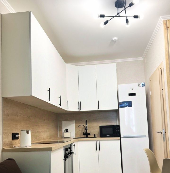 - Кухня-гостинная с большим холодильником, микроволновкой, духовкой, индукционной плитой и бесшумной раковиной