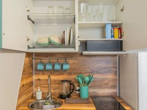 Кухня оснащена бытовой техникой: холодильник, микроволновая печь, электрический чайник. Есть столовая посуда.