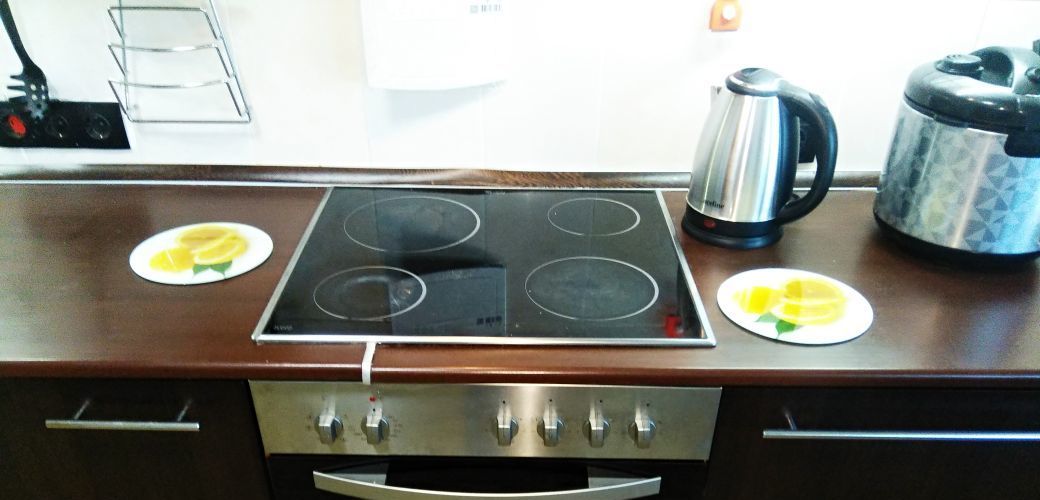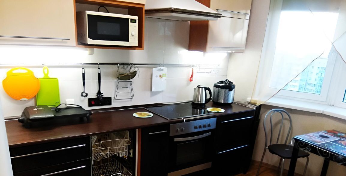 - посудомоечная машина, плита стеклокерамика с духовкой, микроволновка, ростер, скороварка и т.д. Панорамное эркерное окно на кухне (см. фото)