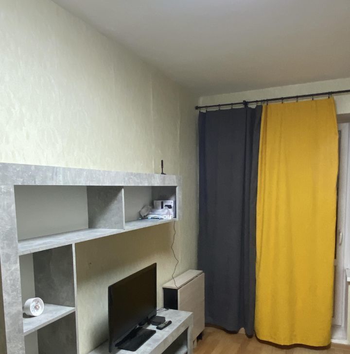 В комнате есть шкаф, стеллаж с подставкой под телевизор, диван -кровать с только что купленным матрасом.