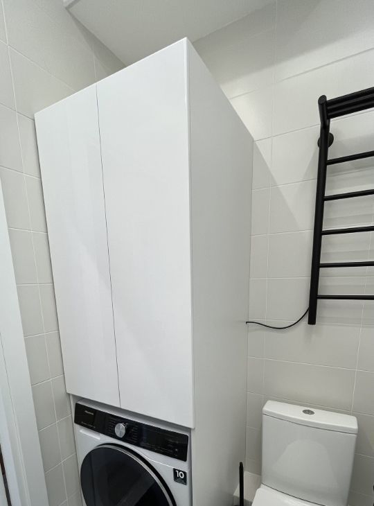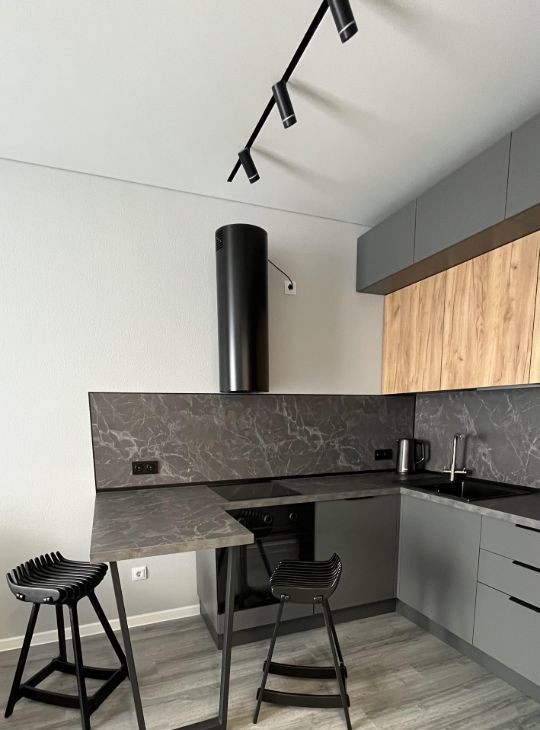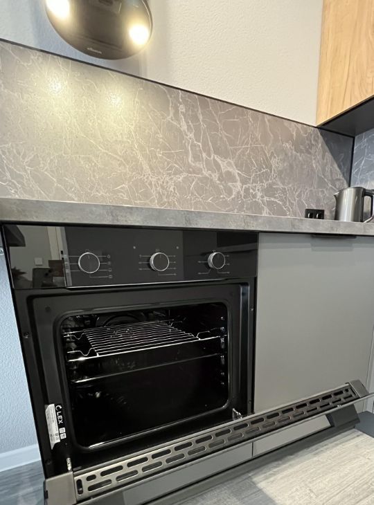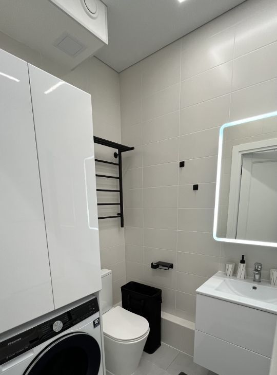 На кухне установлен кондиционер, ПММ, встроенный холодильник, фильтр питьевой воды (встроен в смеситель), варочная панель, духовой шкаф, микроволновая печь, вытяжка.
