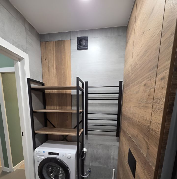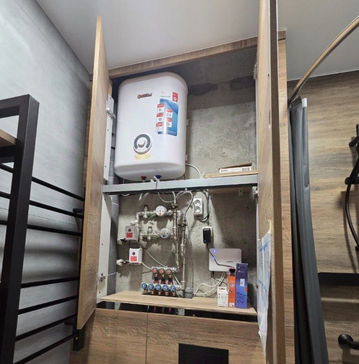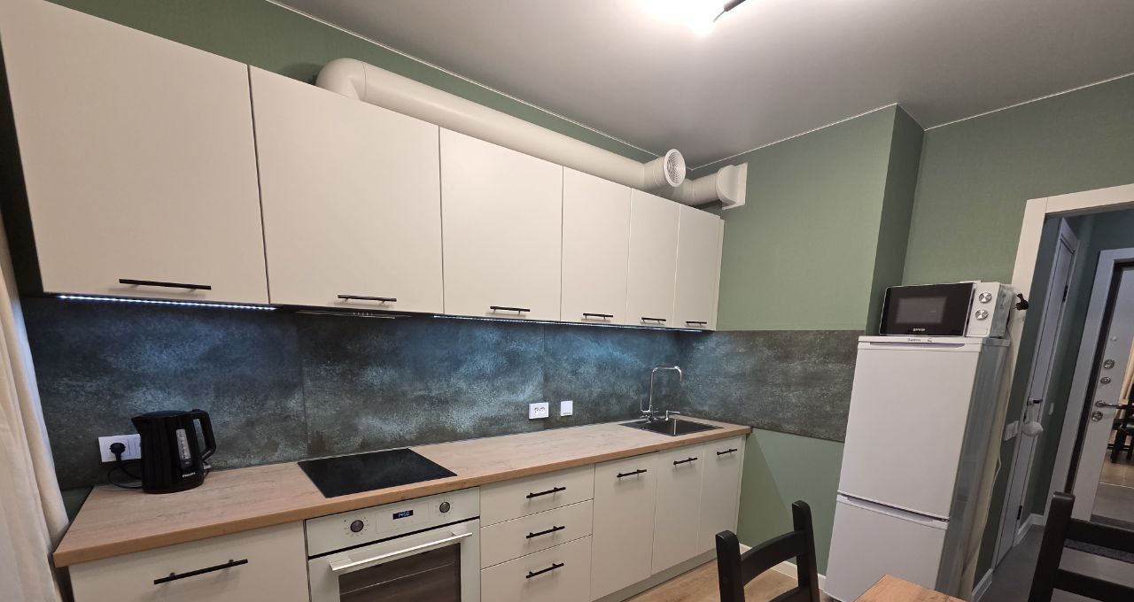 Техника: варочная панель, духовка, холодильник, микроволновка, стиральная машина, посудомоечная машина, бойлер, телевизор.