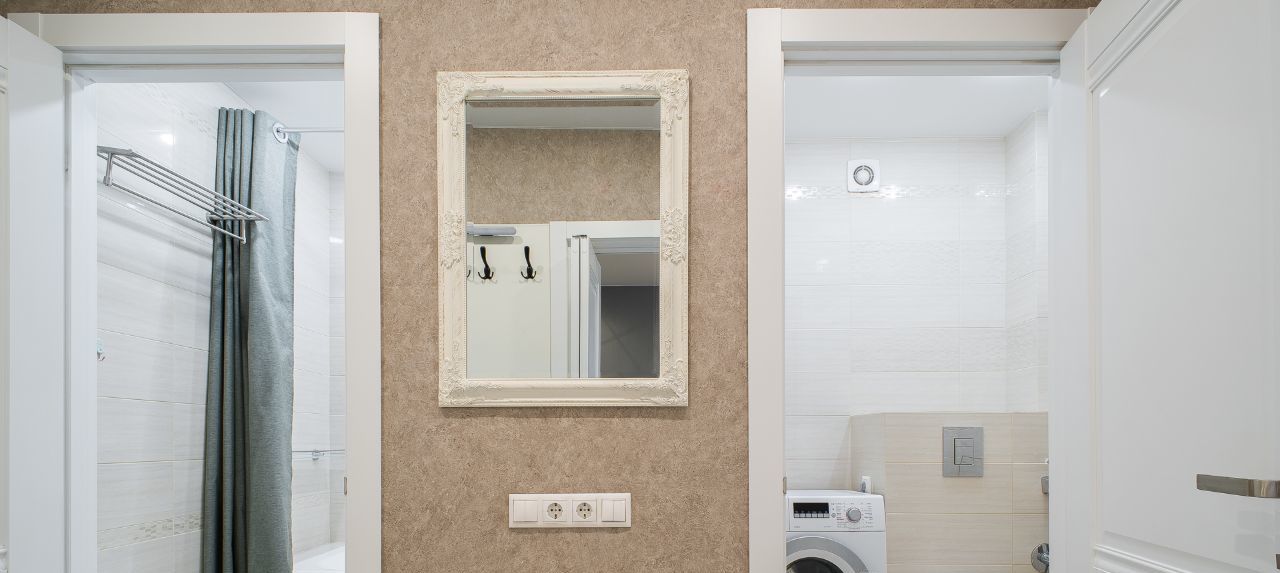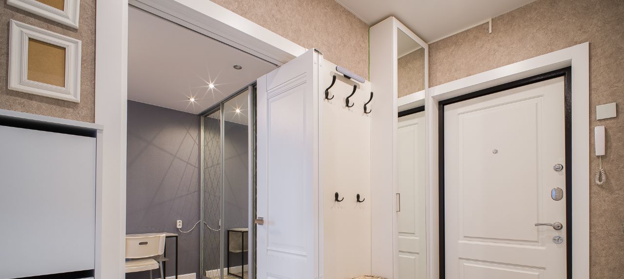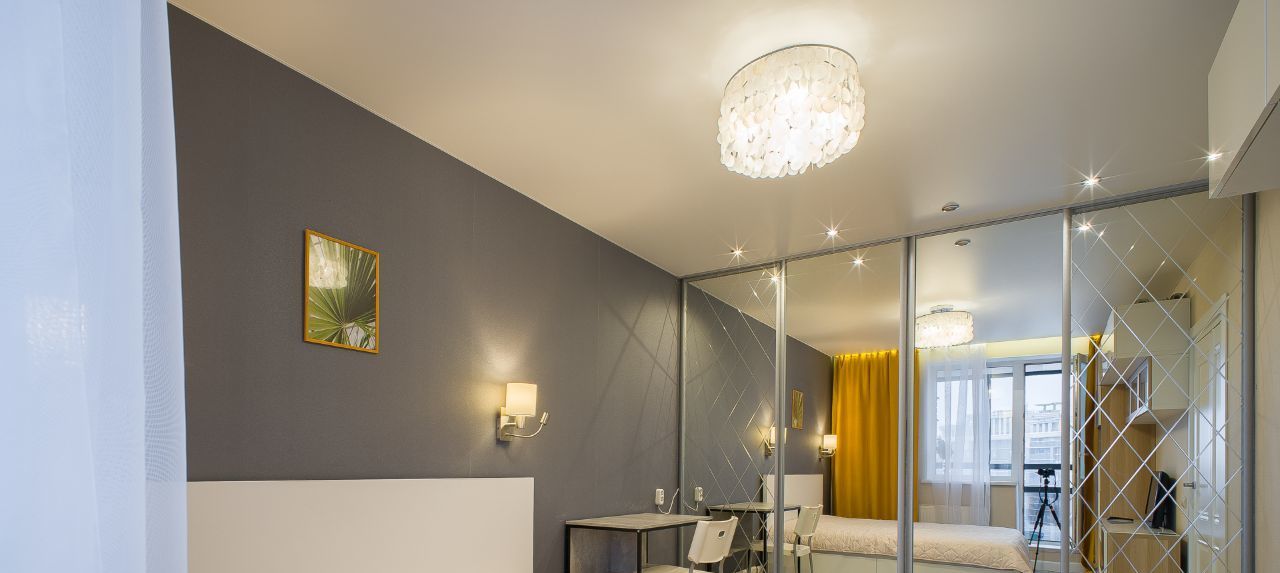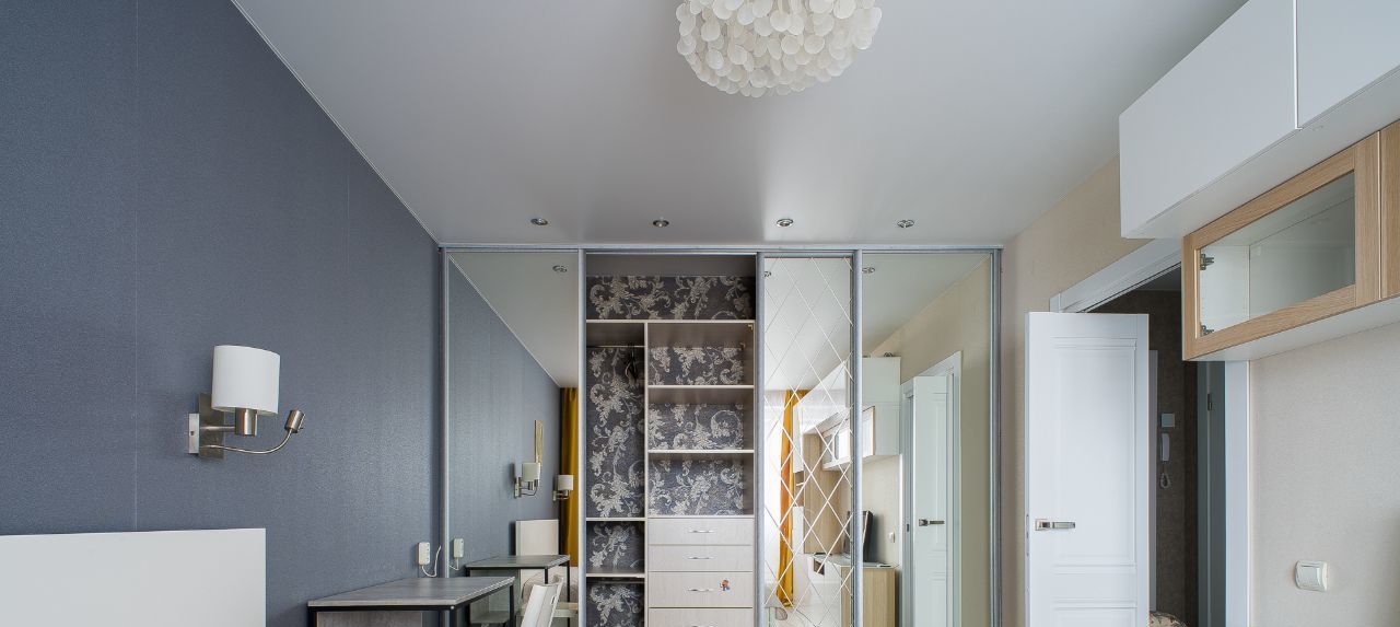 В квартире установлена стильная мебель, включающая в себя двуспальную кровать и вместительный шкаф-купе с зеркальными дверями.