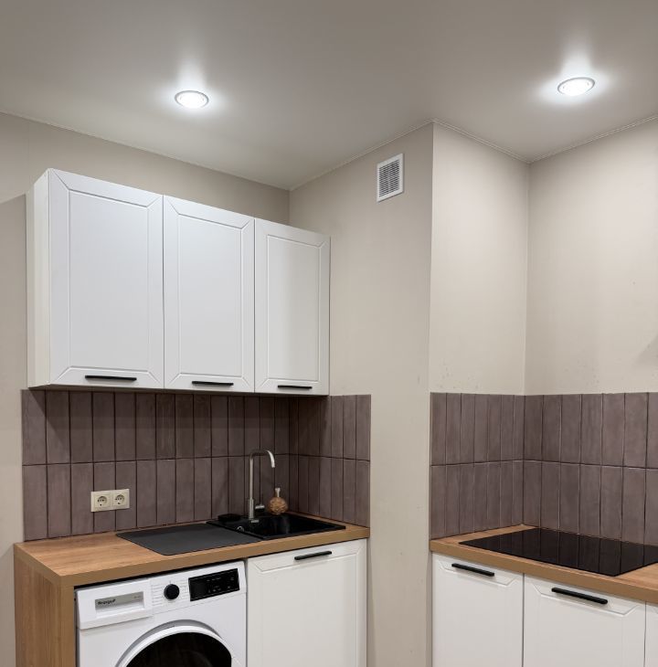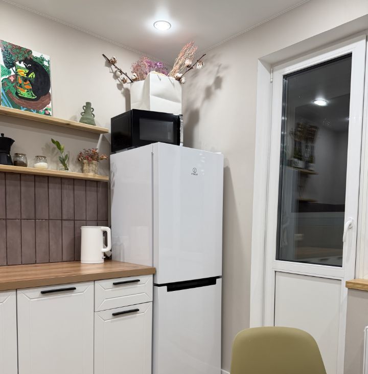 На кухне — стиральная машина, плита, холодильник, микроволновая печь, чайник. Духовки нет.