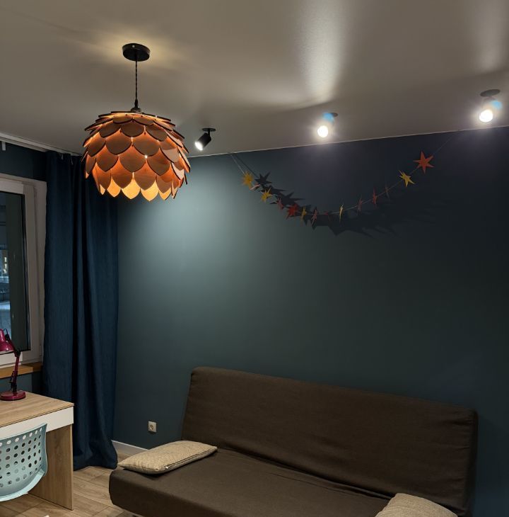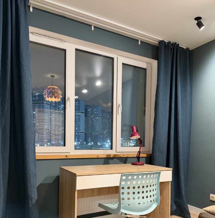 В комнате — раскладной двуспальный диван, рабочее место, комод, шторы блэкаут. Планируется доустановка телевизора 55 дюймов.