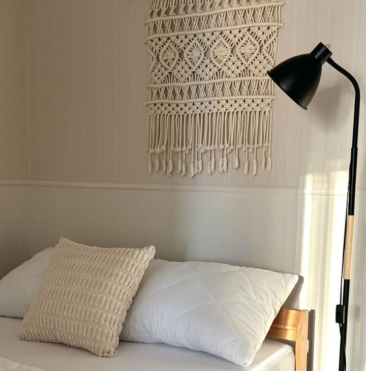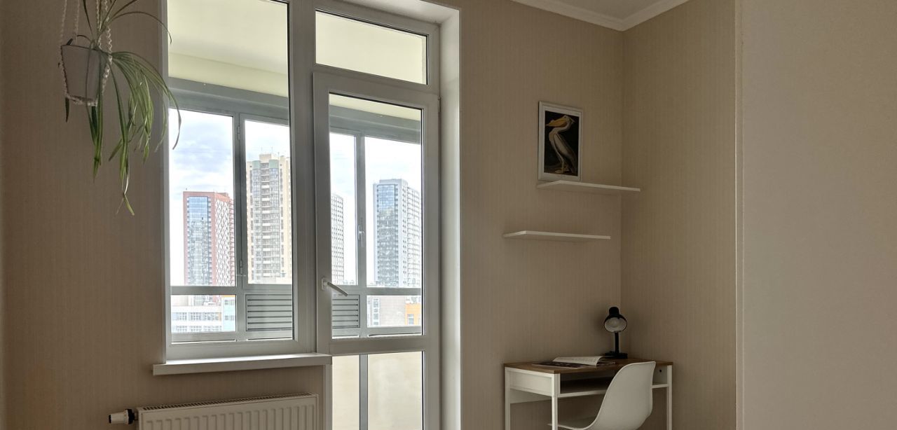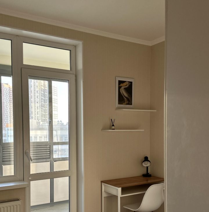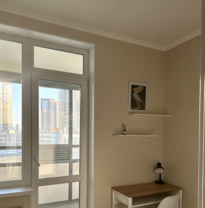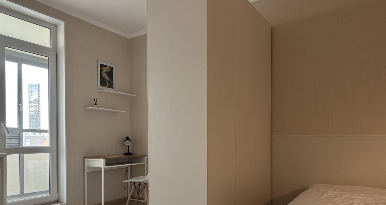 Комната разделена на две части. В спальной зоне кровать с удобным матрасом, новыми подушками и одеялом. В кабинете рабочий стол и стул. Между ними очень удобный вместительный шкаф. Есть широкая просторная лоджия.