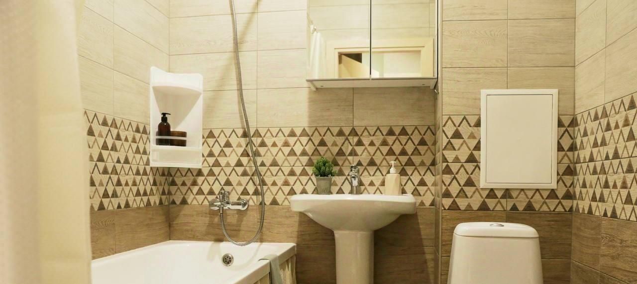 В санузле полноценная ванная, стиральная машинка, стеллаж для хранения.