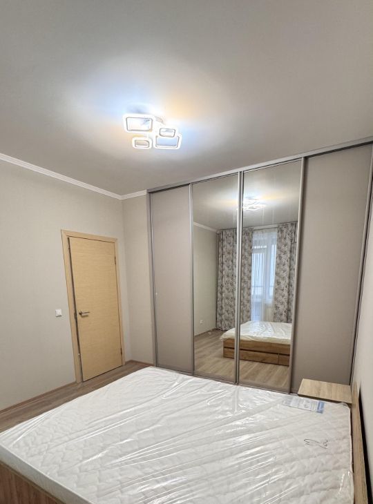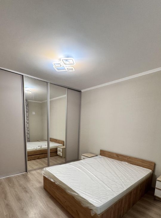 Комната-спальня (12 кв.м) обставлена двуспальной кроватью с матрасом, вместительным шкафом-купе.