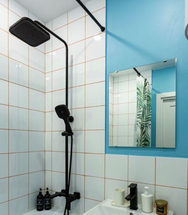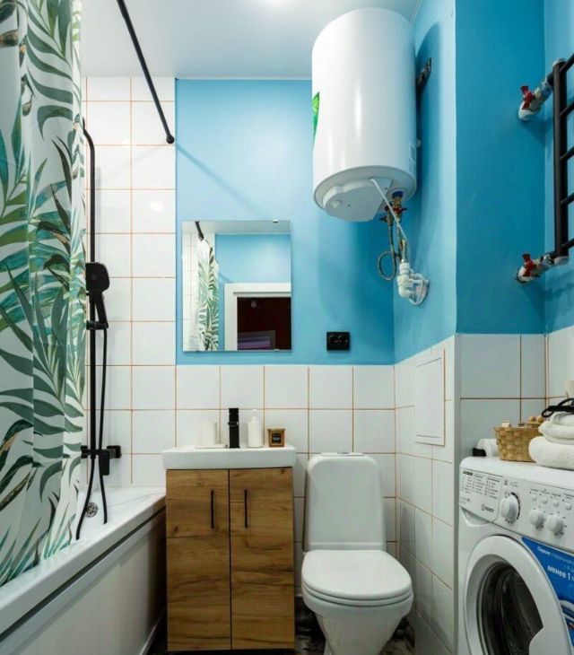 Совмещённый санузел с полноценной ванной и стиральной машинкой. Есть гигиенические принадлежности (шампунь, гель для душа, ватные диски и палочки), полотенца, фен для волос.