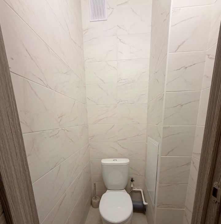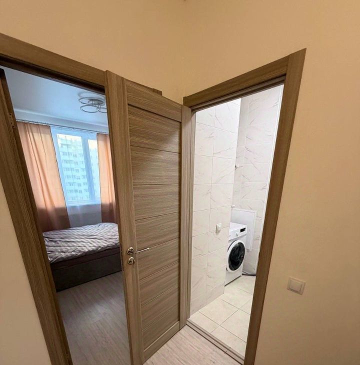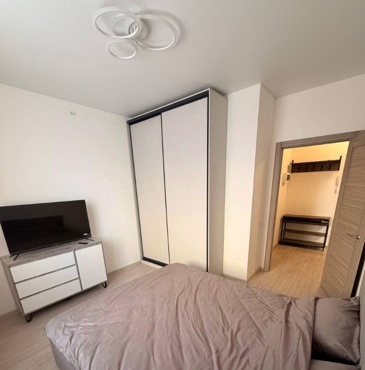 В квартире выполнен свежий евро ремонт, все новое, еще никто не проживал. Просторная комната оборудована двуспальной кроватью и вместительным шкафом.