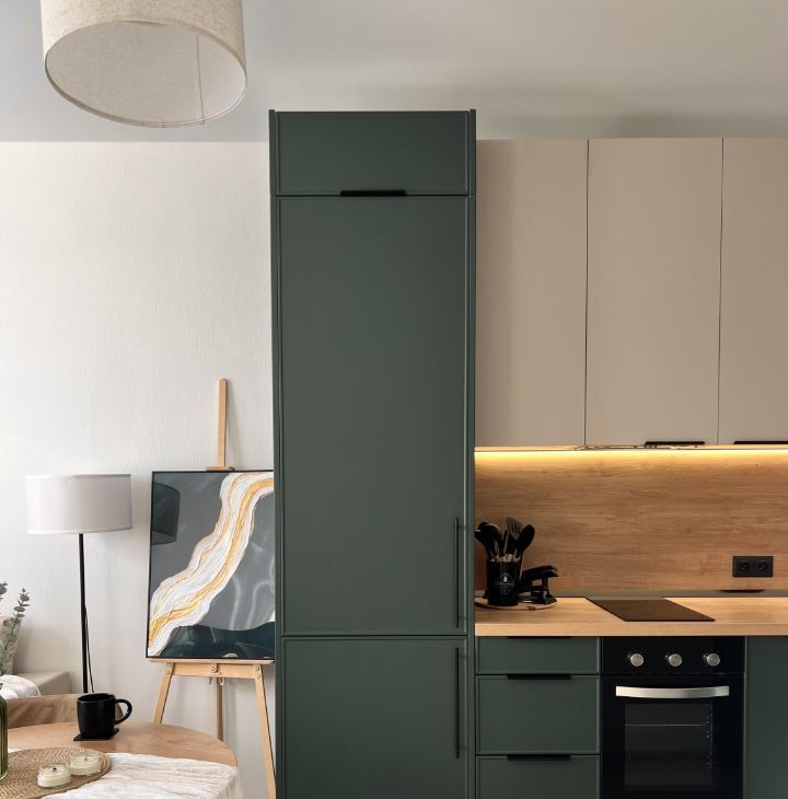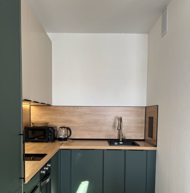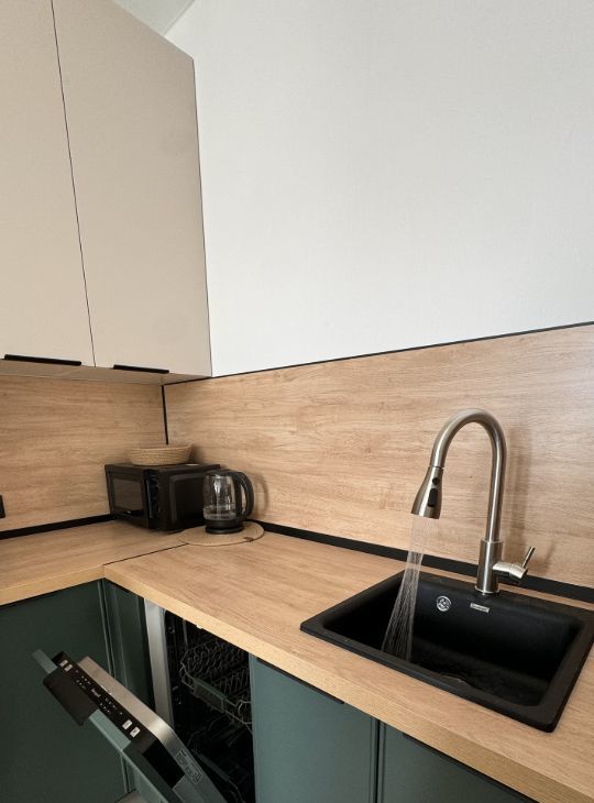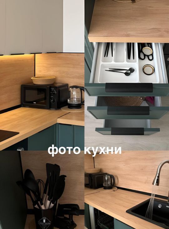 КВАРТИРАПросторная кухня: посудомоечная машина, духовой шкаф, варочная панель, встроенный холодильник, микроволновка, чайник, вытяжка, сенсорная подсветка, смеситель с 3 режимами и выдвижным изливом