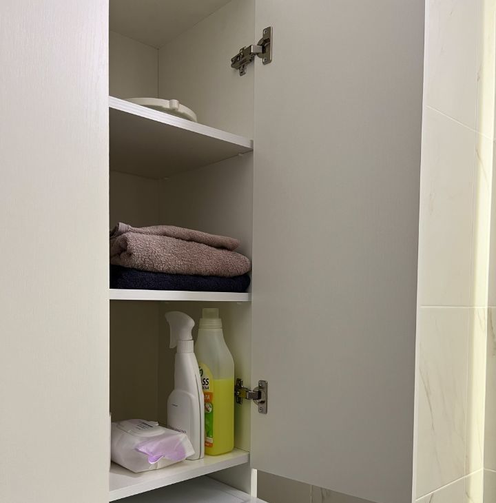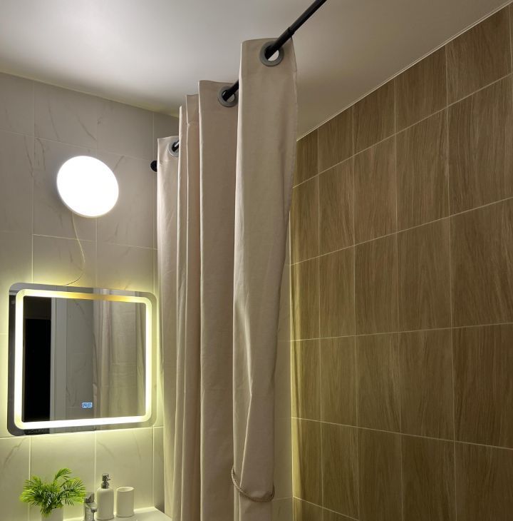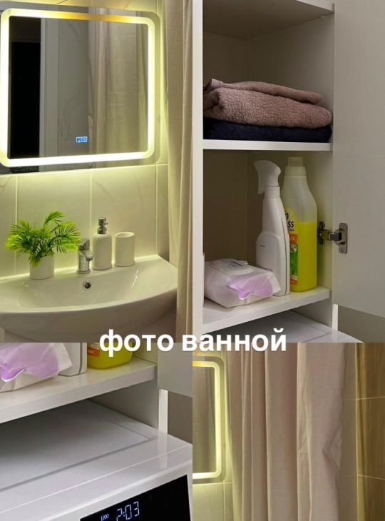 Ванная: стиральная машина с паром и Bluetooth, шкафы для хранения, зеркало с подсветкой и обогревом, акриловая ванна, сильный напор воды без перебоев