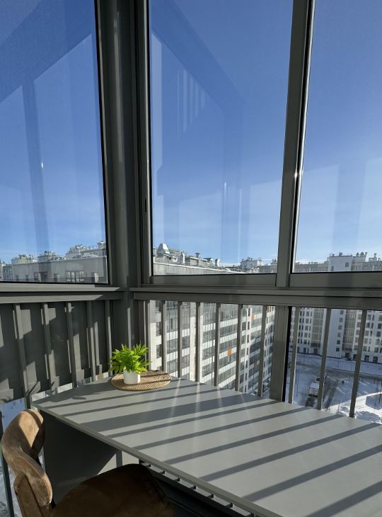 Балкон: застеклённый, светлый, оборудовано рабочее место. Можно использовать как кабинет или доп. зону хранения