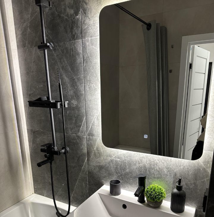 Сантехника (все новое): ванная 170 см, смесители, тропический душ, инсталляция, раковина с ящиком для хранения, зеркало с режимом подсветки