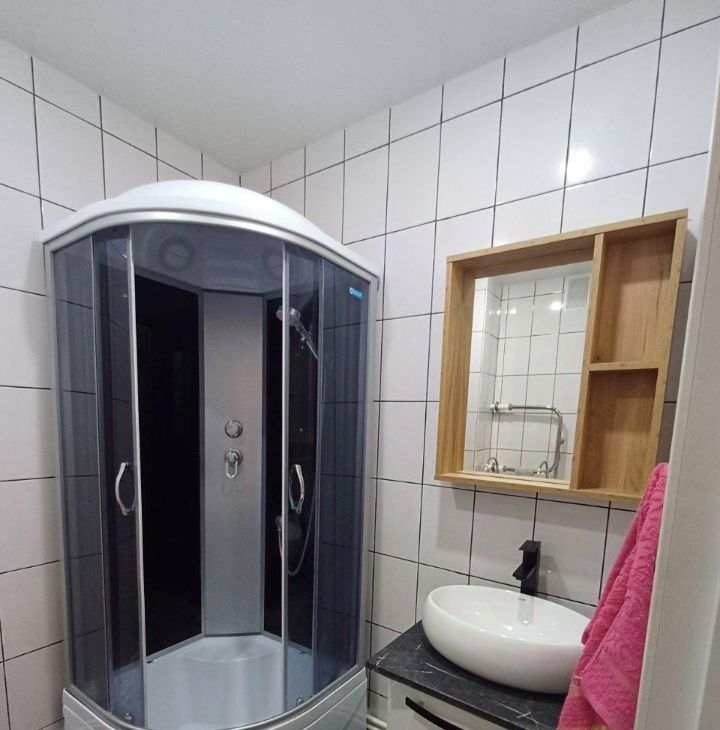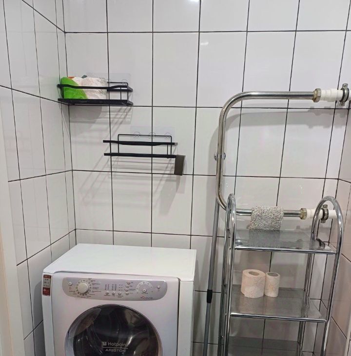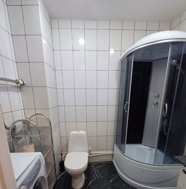 Санузел совмещенный, оснащён душевой кабиной и стиральной машиной. Из окон открывается вид на двор с открытой парковкой.
