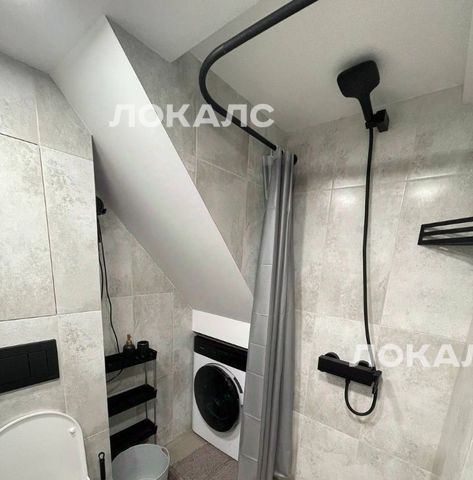 Санузел с душевой кабиной и встроенной стиральной машиной.