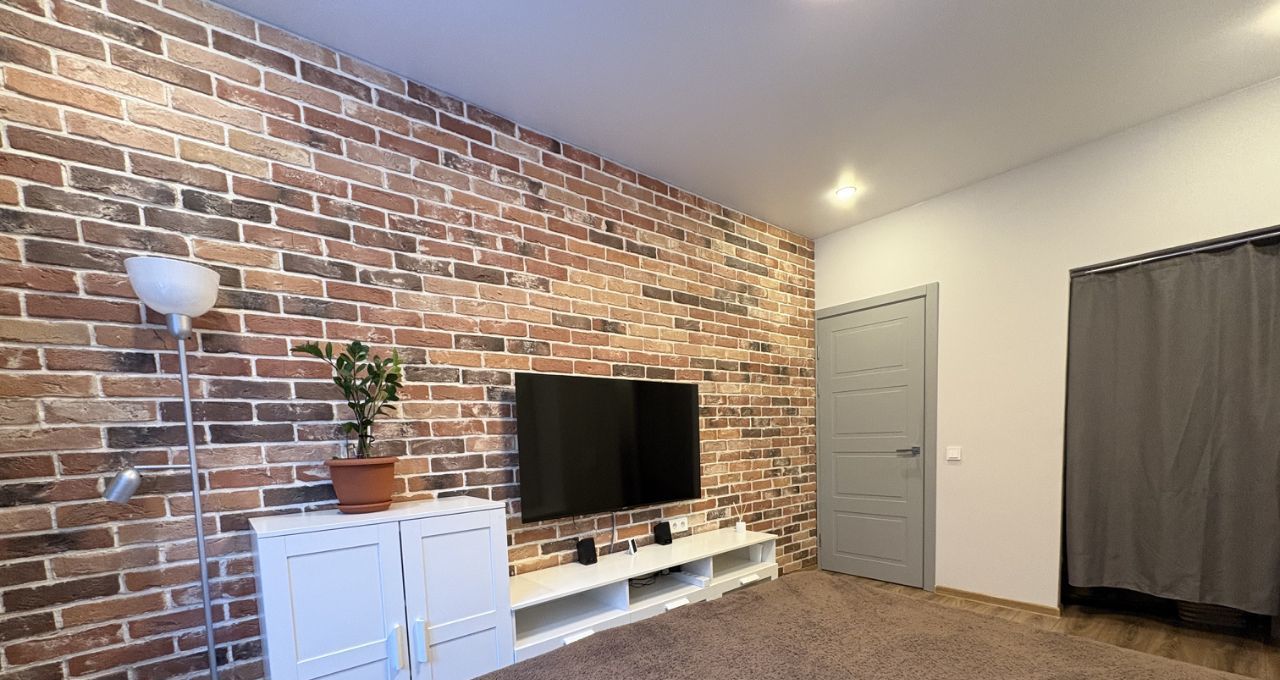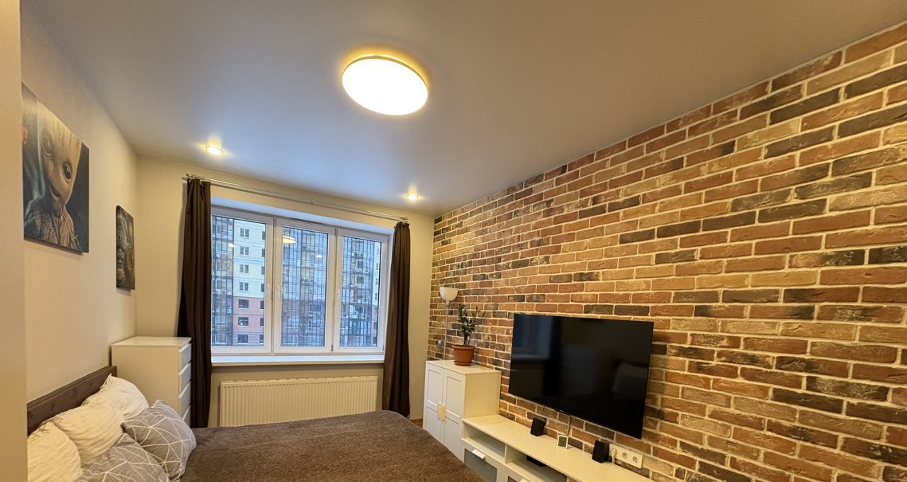 В комнате установлены два спальных места. Из окон открывается вид на городскую панораму. Лоджия застеклена и отделана кирпичом, что создает дополнительное пространство для отдыха.