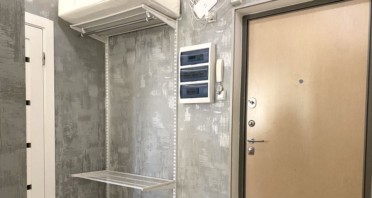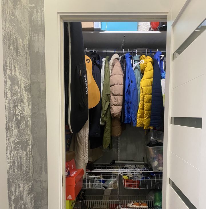 В квартире множество мест хранения : большой шкаф в спальне, гардеробная, система хранения в прихожей