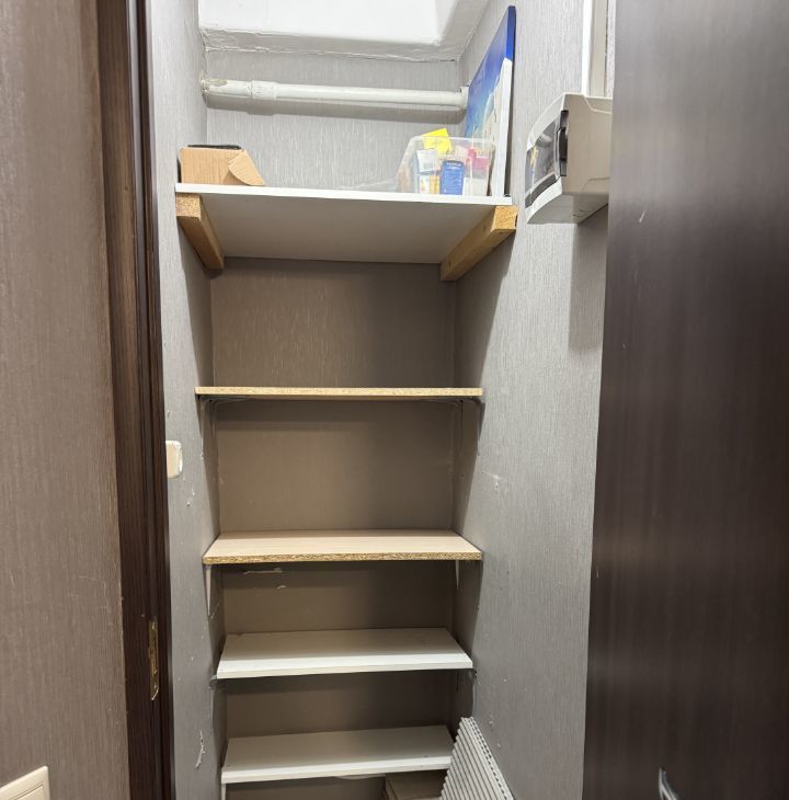 Предусмотрено много мест для хранения вещей. Гардеробные шкафы в коридоре и комнате, кладовая.