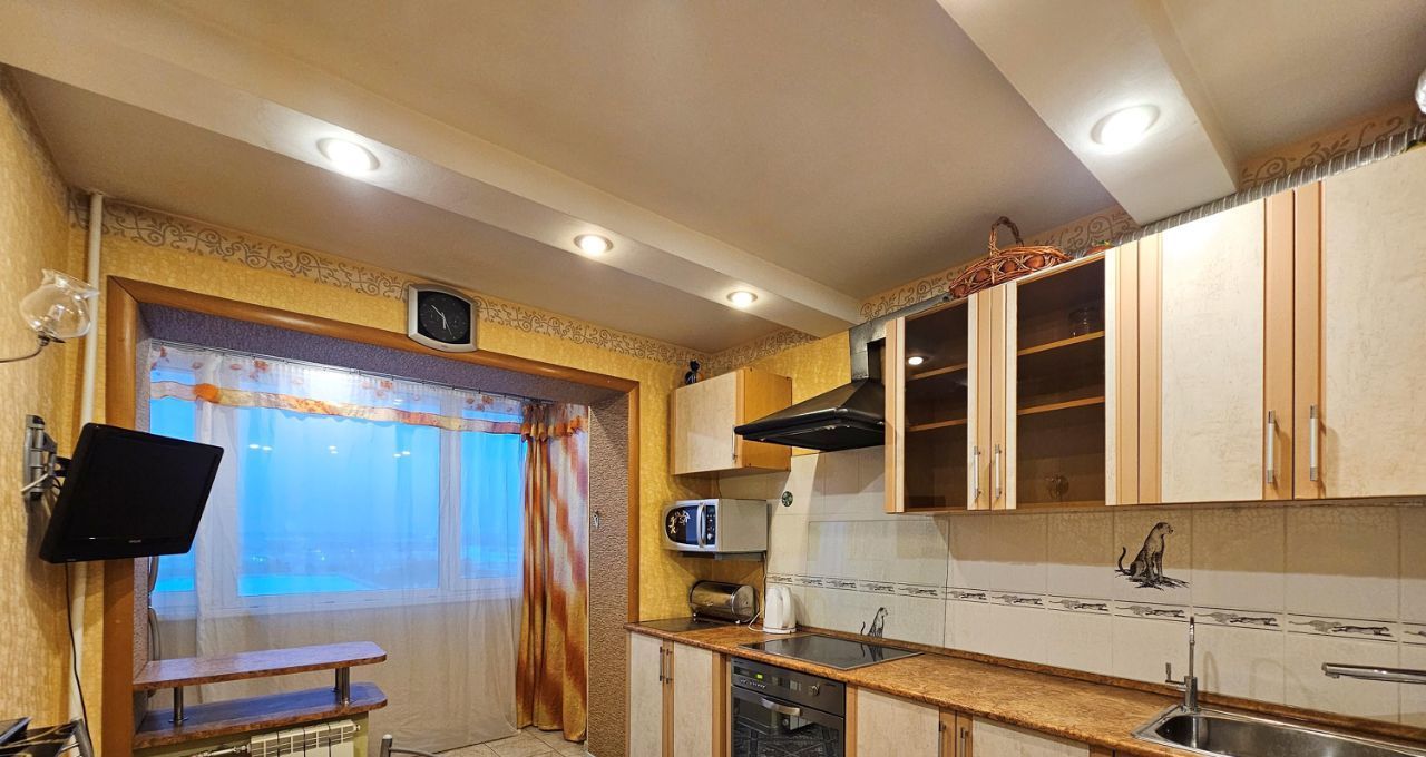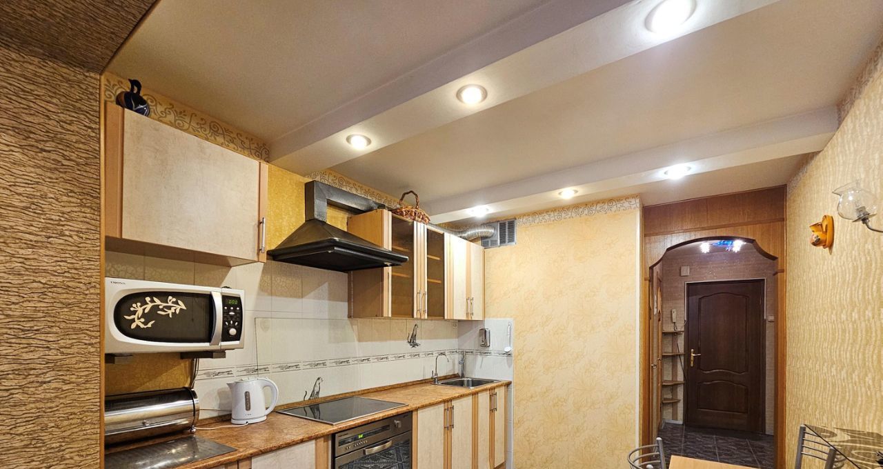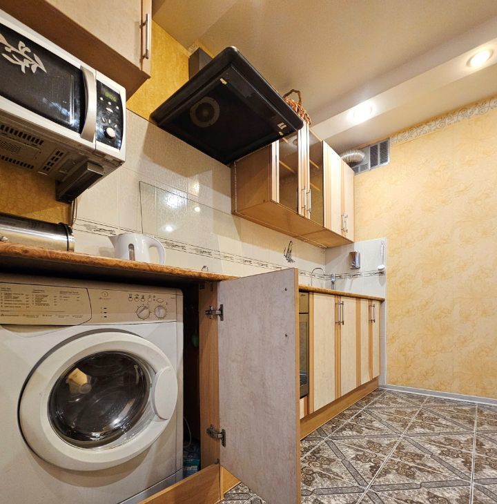 На кухне - встроенный гарнитур со всей необходимой техникой: варочная поверхность стеклокерамика, духовой шкаф, СВЧ, стиральная ашина, чайник, вытяжка. Фильтр для питьевой воды.