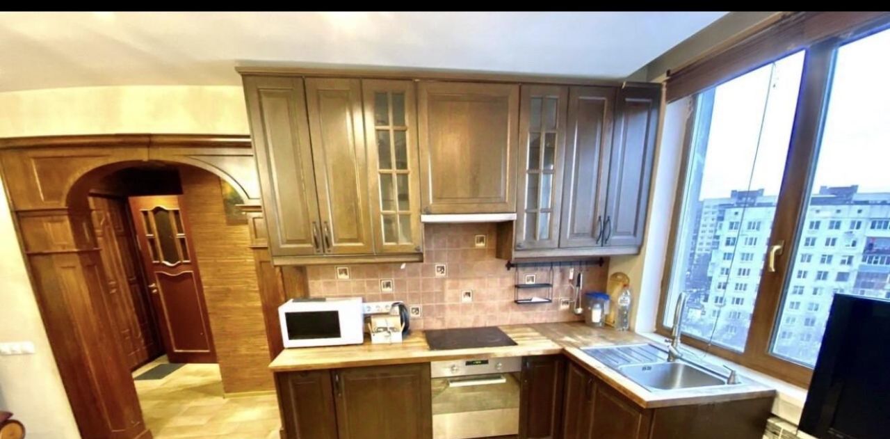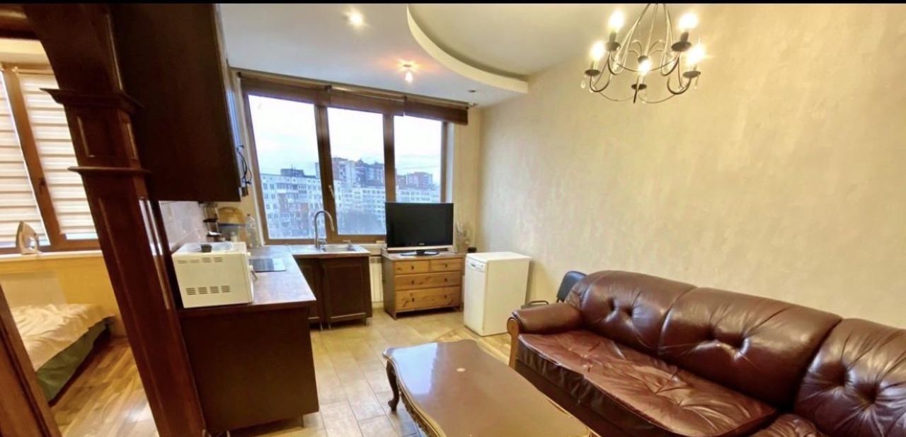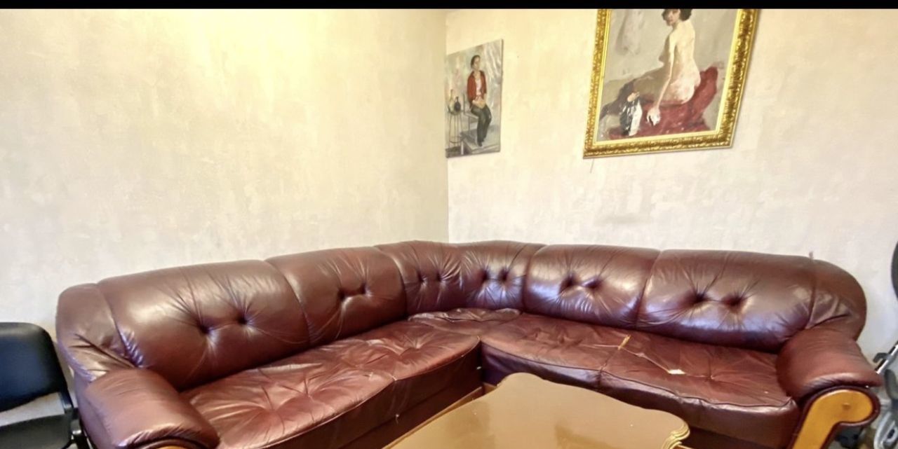 кухня -гостиная 18 кв м кухонный гарнитур , стол из массива, угловой кожаный диван, посудомоечная машина. , спальня с кроватью.
