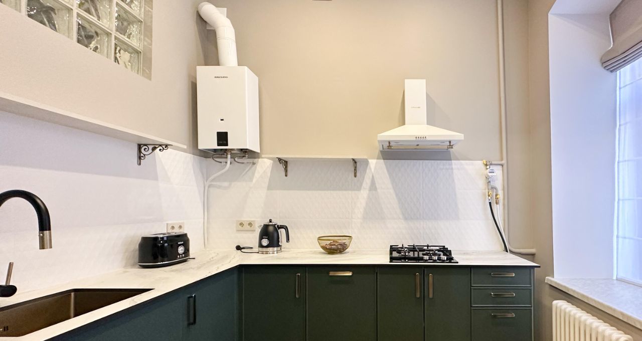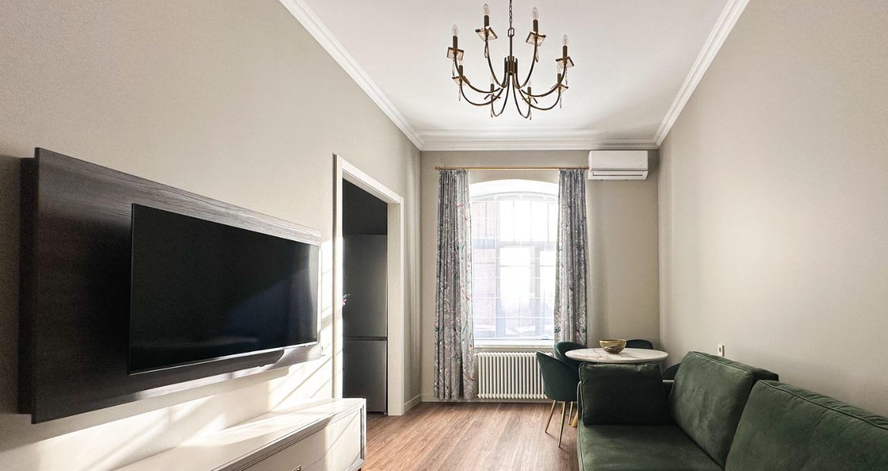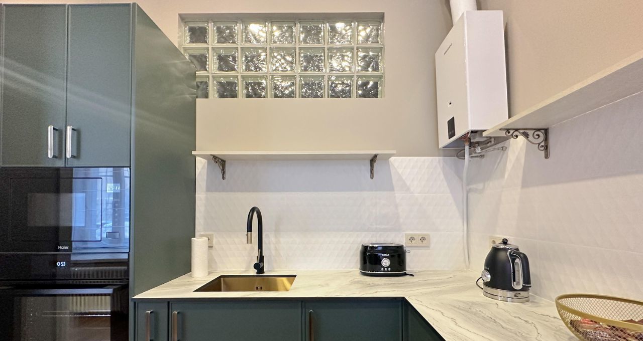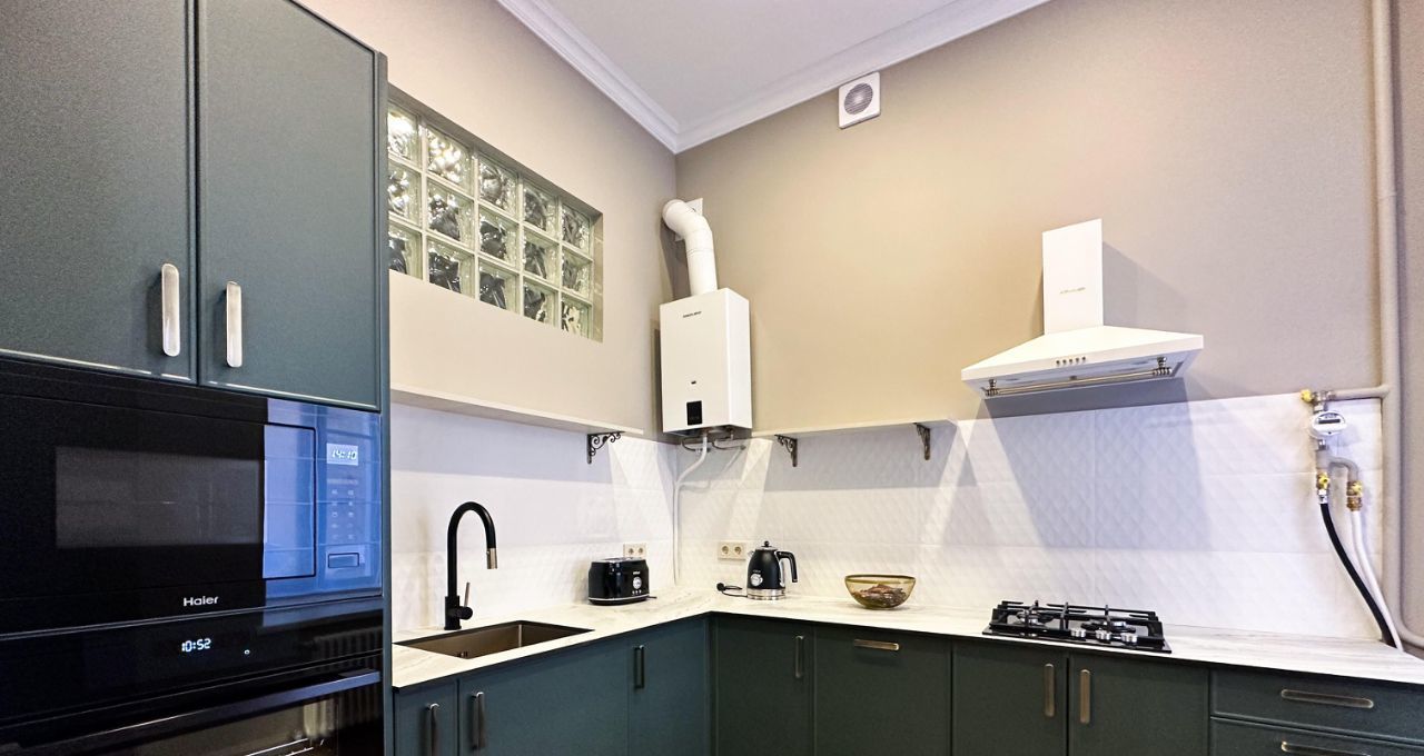 Кухня-гостиная: Просторное светлое пространство. Есть посудомоечная машина, встроенные СВЧ и духовой шкаф, чайник и тостер. В гостевой зоне — раскладной диван, телевизор и кондиционер.