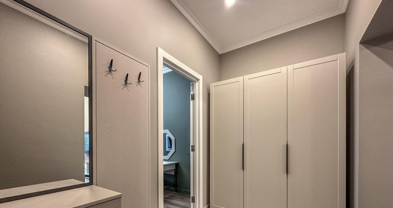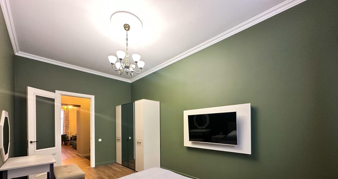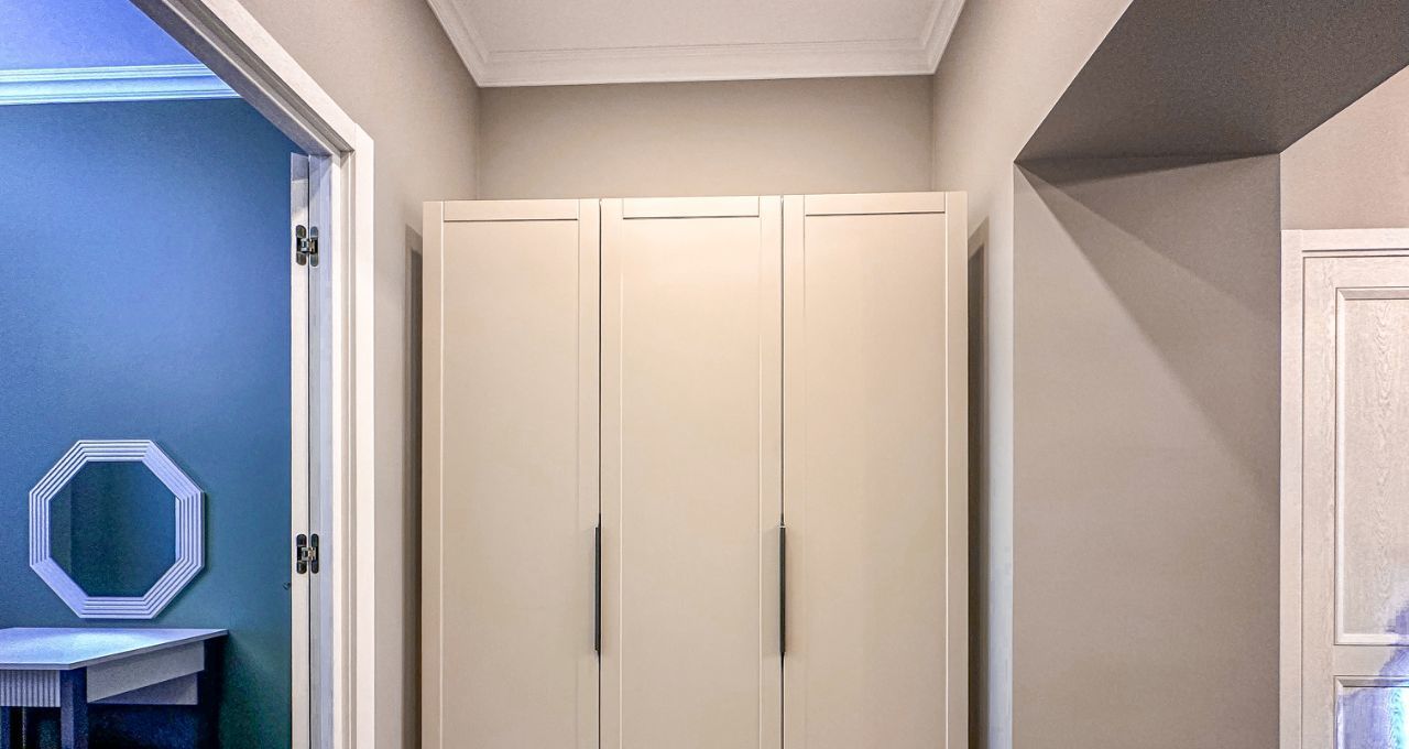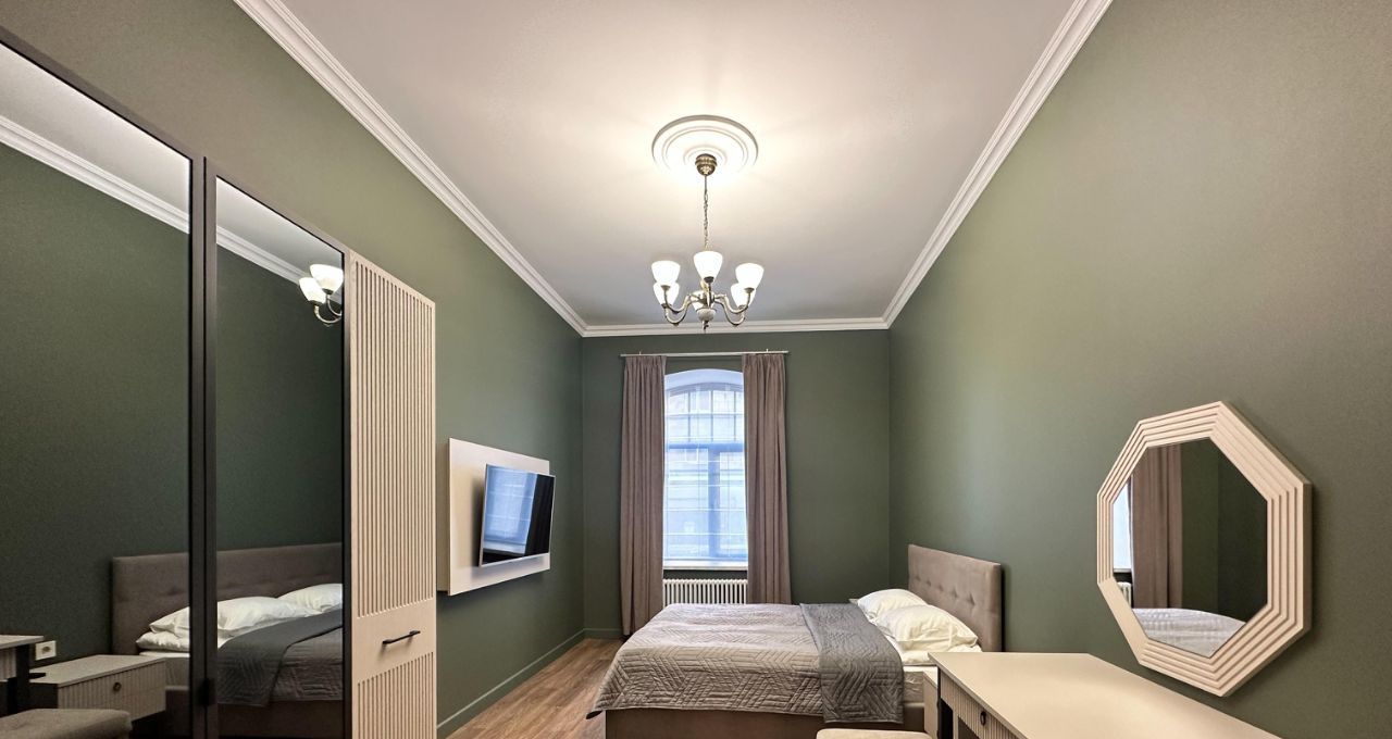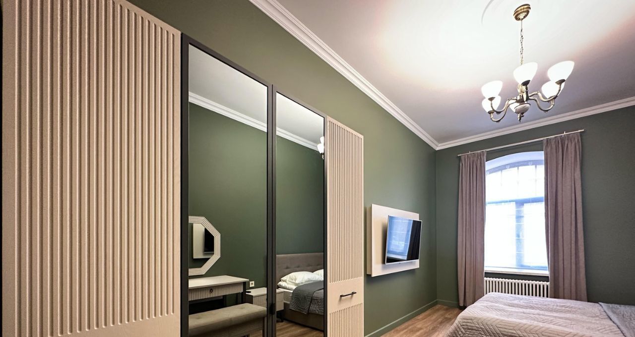 Спальня: Изолированная комната с большой двуспальной кроватью (ортопедический матрас) и вместительным встроенным шкафом-купе.
