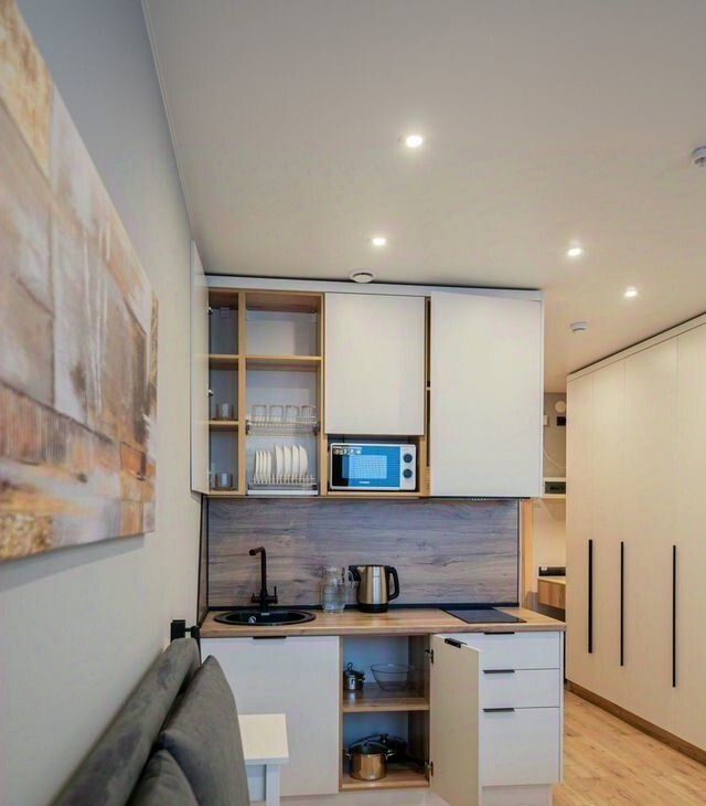 Общее оснащение номера: кухня с варочной поверхностью и вытяжкой, СВЧ- печь, чайник, набор посуды,большой холодильник, кровать (двуспальная 180*200) с высококачественными ортопедическими матрасом, полный комплект текстиля, блэкаут-шторы, телевизор со Smаrt ТV, рабочая поверхность, система хранения, собственная ванная комната с душевой, стиральная машина, фен, утюг, гладильная доска,Wi-Fi роутер, сейф, кондиционер,пылесос,зонированное освещение в квартире. Особенности и преимущества проживания в Отеле 25/7 Заневский: - бесшовный wi-fi на всей территории отеля; - прачечная самообслуживания; - служба безопасности, закрытая территория; - возможность проживания семьям с детьми и домашними питомцами; - развитая инфраструктура в шаговой доступности; - отличная локация: метро Ладожская и Ладожский вокзал в 2х минутах ходьбы, до центра города 20 минут на общественном транспорте, 5 минут до выезда на КАД; - близкое расположение к деловым, научным, образовательным; медицинским, культурным и промышленным кластерам города; - наличие просторного подземного паркинга, мест платной парковки, а также вместительной бесплатной парковки непосредственно у отеля и гипермаркета ОКЕЙ