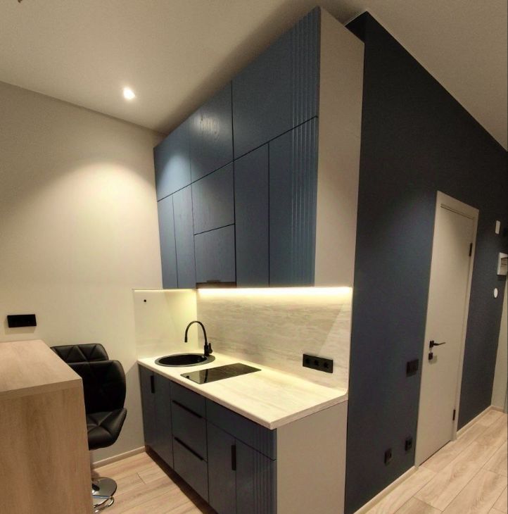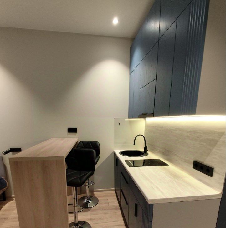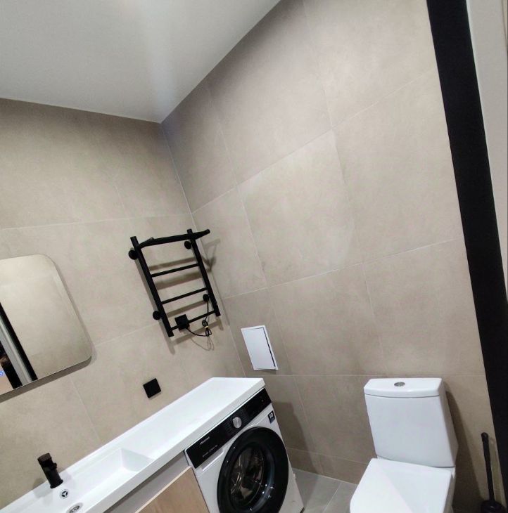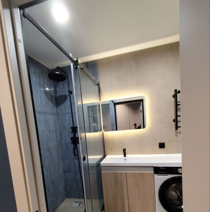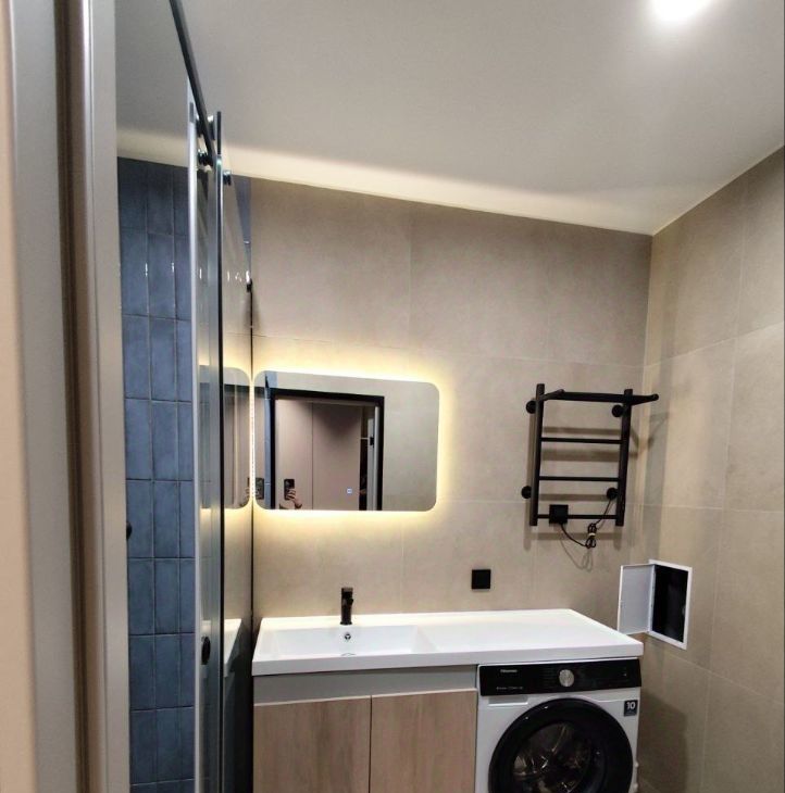 Современный комплект мебели стенки со шкафами , двухспальная кровать с ортопедическим матрасом, стойка барная, встроенный комплект мебели для работы IT, продуманное освещение . В ванной установлена просторная душевая , санузел-инсталяция, стиральная машина - автомат.