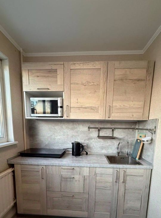 Квартира после косметического ремонта, на кухне установлен новый кухонный гарнитур.