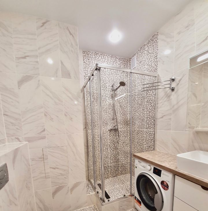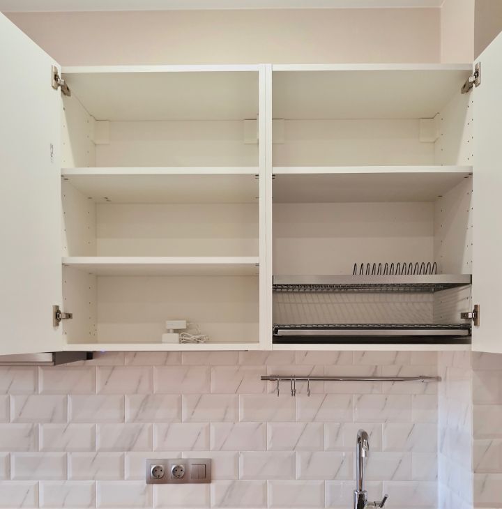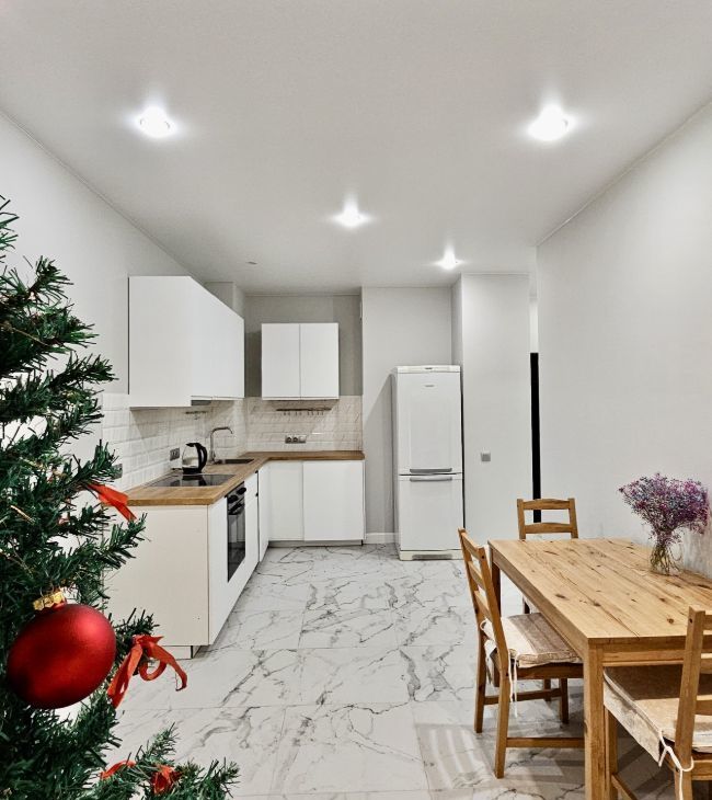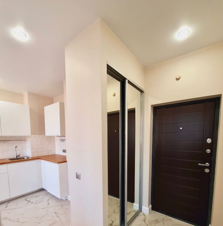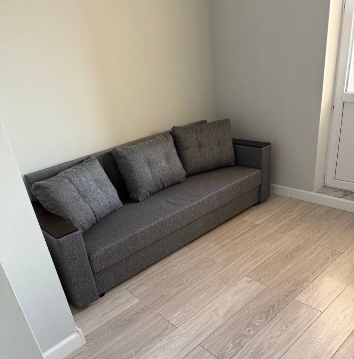 Всё необходимое для комфортного быта уже есть: современная кухня Икеа, холодильник, стиральная машина, встроенный шкаф в прихожей, стол и стулья, новый диван в спальне.